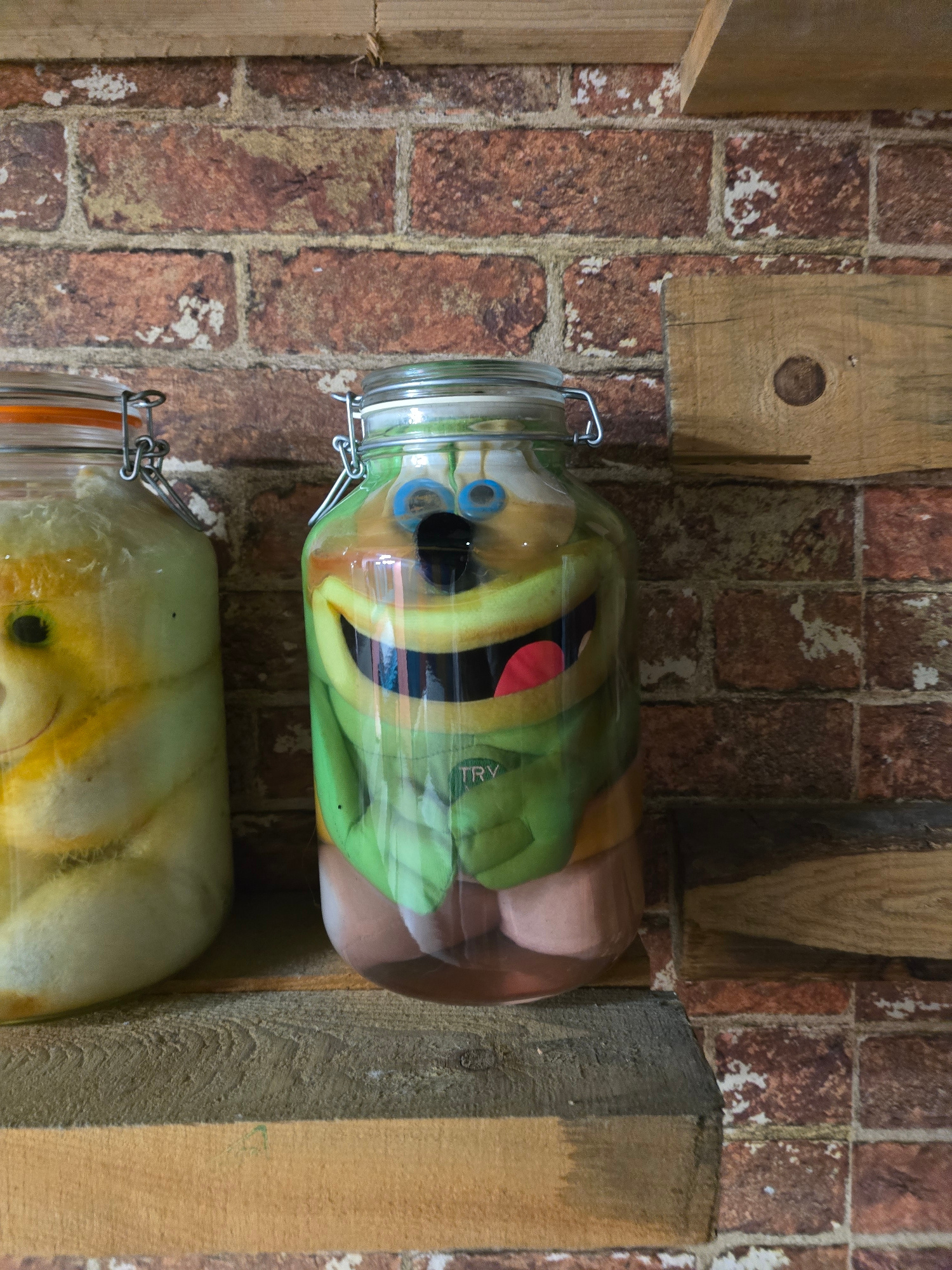 Two glass jars are mounted on a brick wall, supported by wooden structures. The upper jar contains a plush toy resembling a cartoon face with blue eyes, a red tongue, and green and yellow features. Th…read more