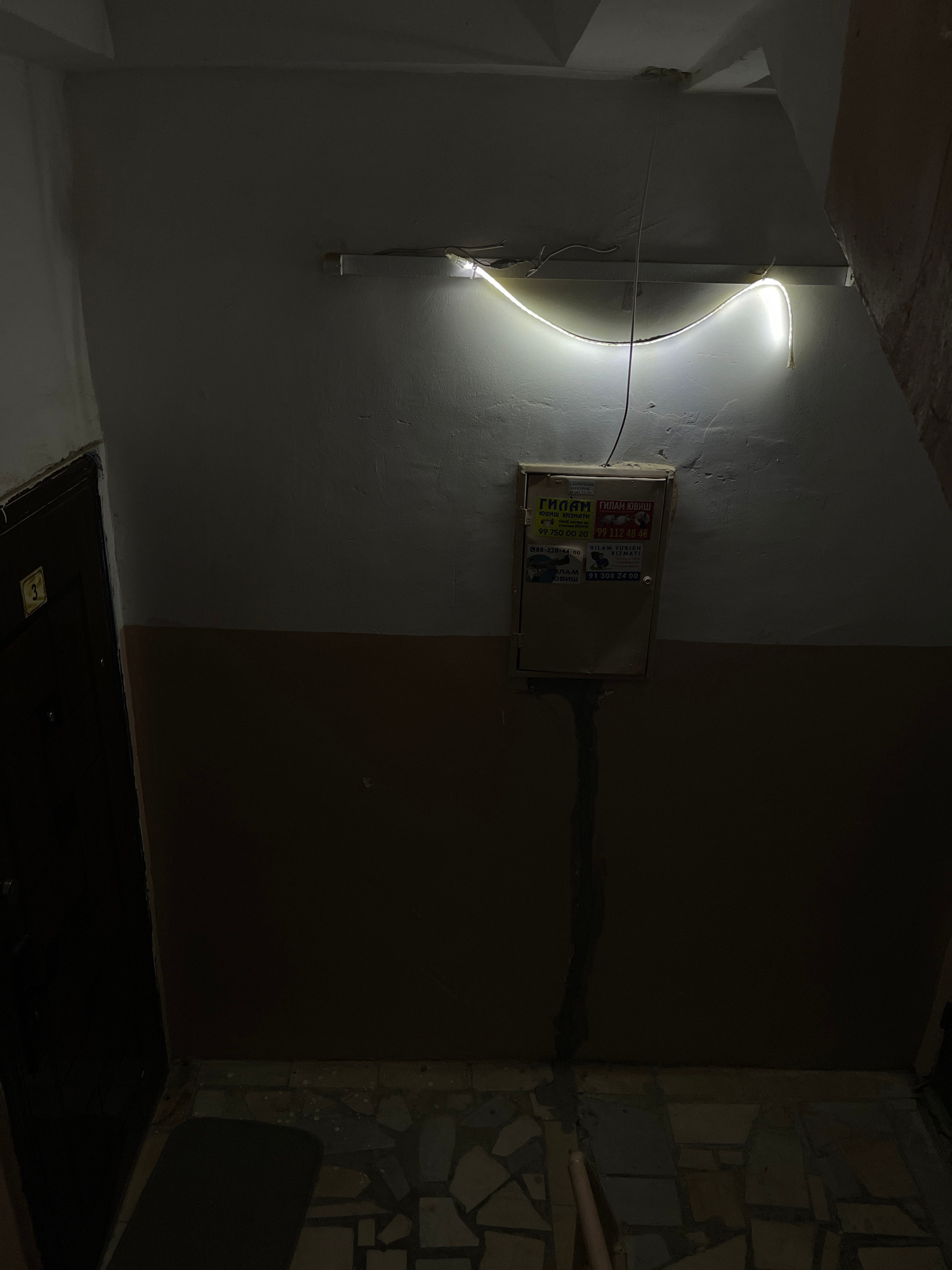 The image captures an interior corner with stark contrasts in lighting. On the left, a bright, curving LED light fixture illuminates a wall with a utility box covered in promotional stickers. The box…read more