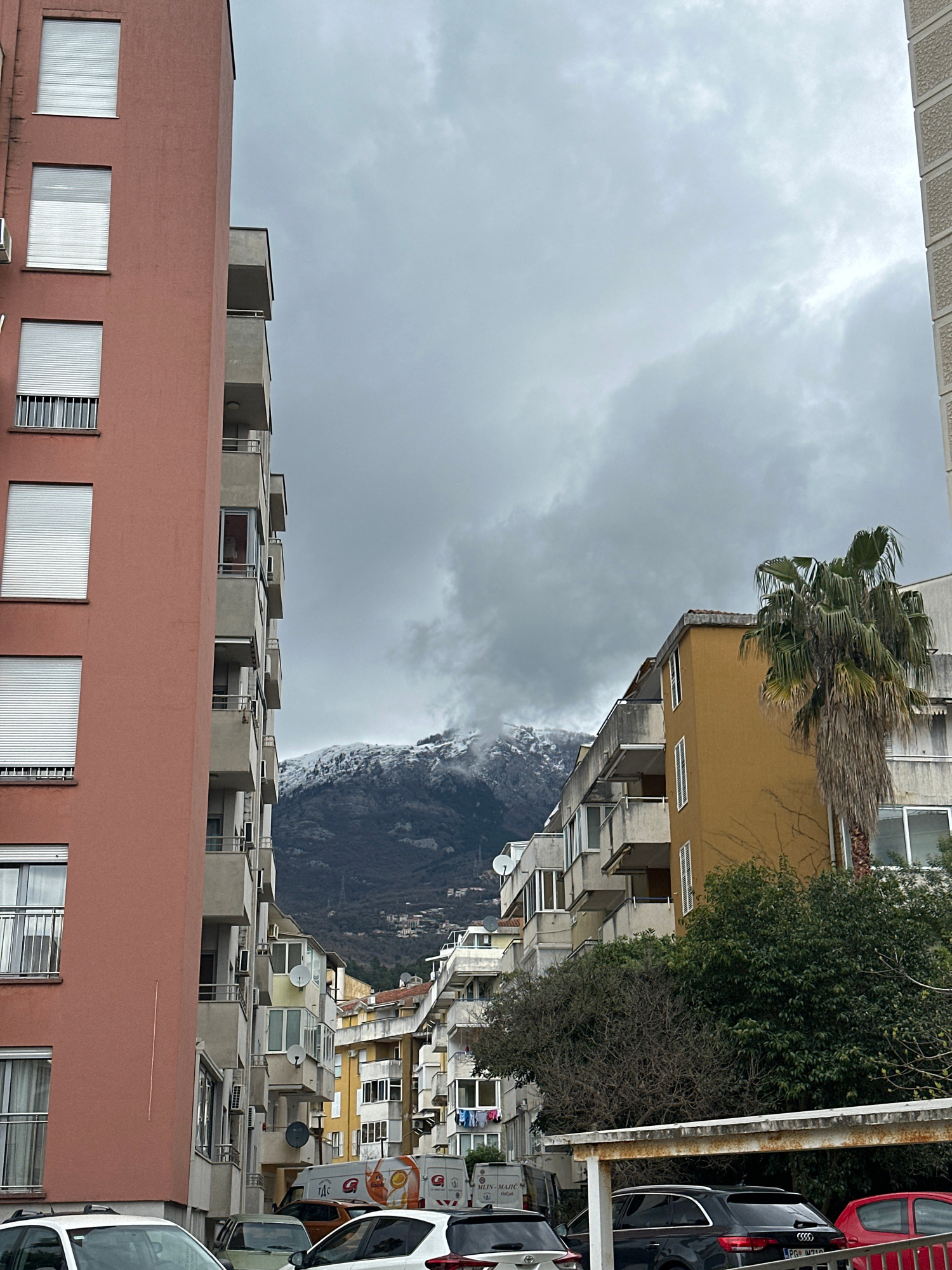 The image portrays an urban residential street scene in Budva, Montenegro, under a heavily overcast, grey sky. In the background, a prominent mountain range with snow-capped peaks is visible, partiall…read more