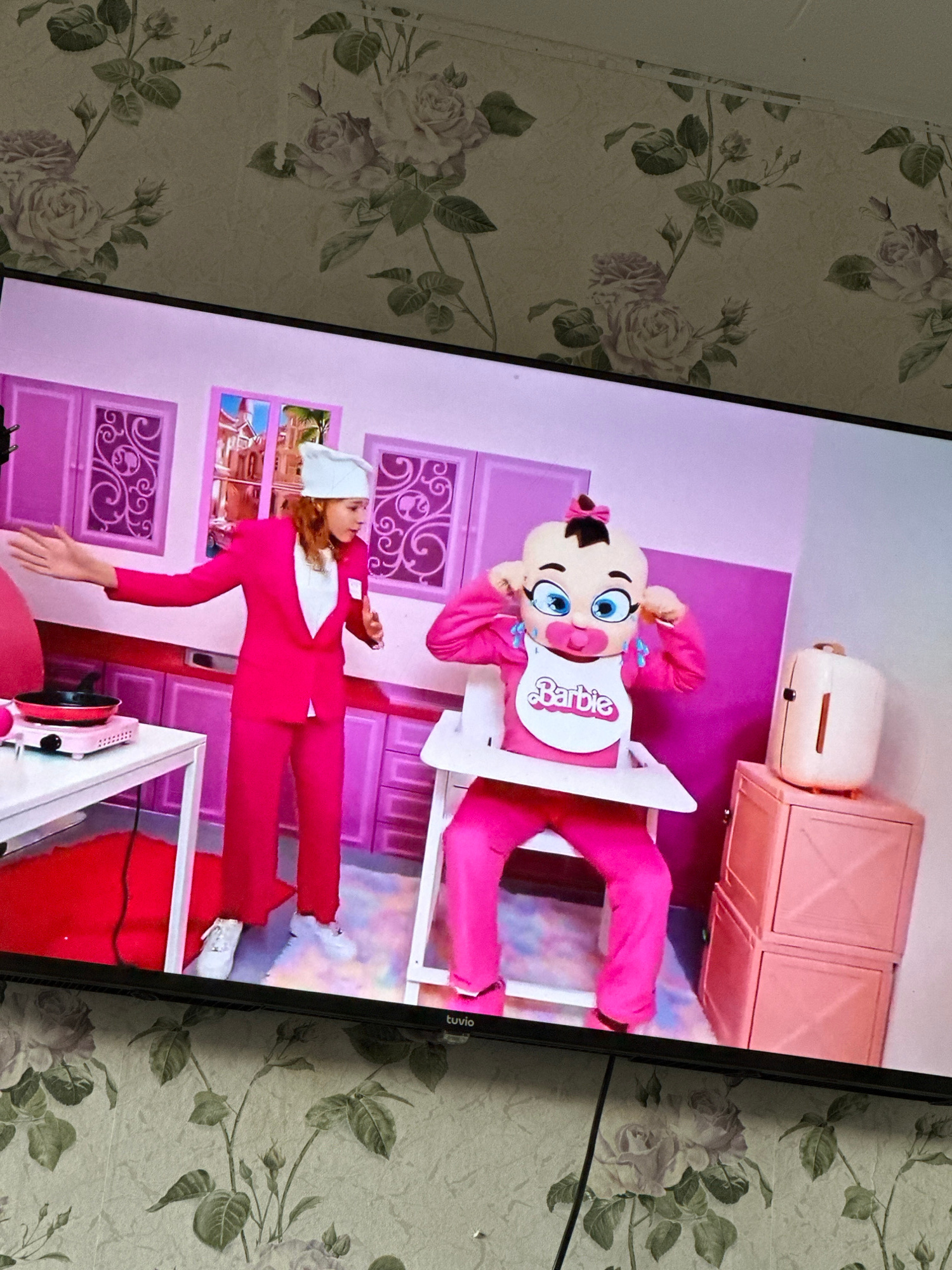 The image displays a television screen showing a vibrant, pink-themed kitchen scene, surrounded by a room with floral wallpaper. The photograph is oriented vertically, with the TV content displayed as…read more