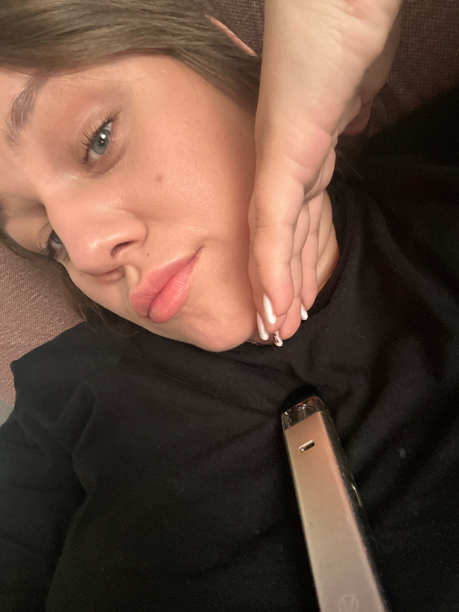 An overhead shot shows a person lying down, looking directly at the camera. The subject appears to be a young adult with light skin, light brown hair, and blue eyes. Their right hand is raised, partia…read more