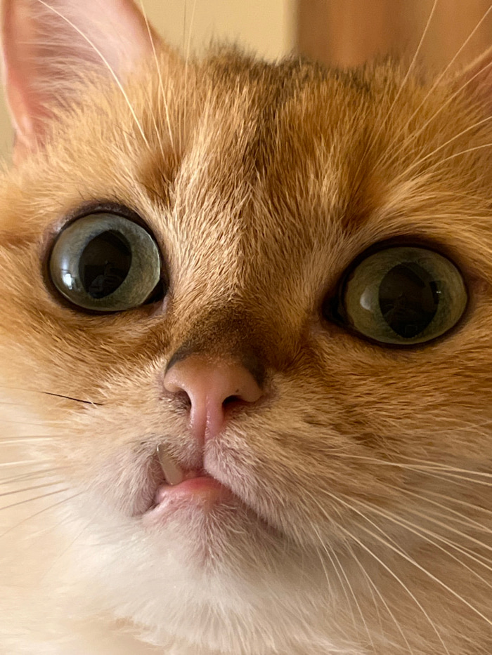 An extreme close-up captures a cat's face, presented at a slightly tilted angle. The feline's large, round eyes dominate the frame, reflecting light and revealing dark pupils. A small, pink nose sits…read more