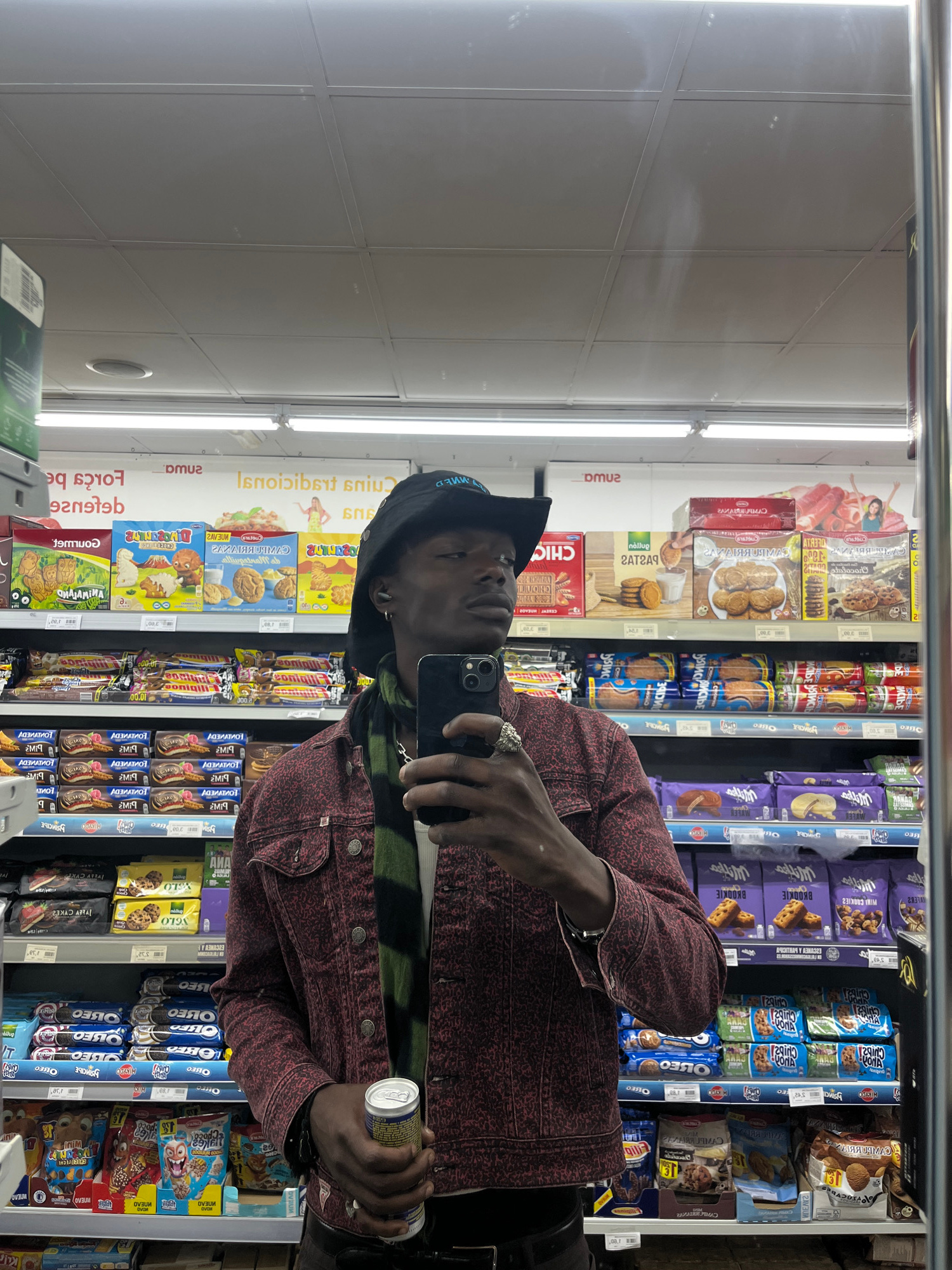 The image captures a sideways mirror selfie taken by a person inside a supermarket or convenience store. The subject is a person, likely male, wearing a dark cap, a dark red/maroon patterned jacket w…read more