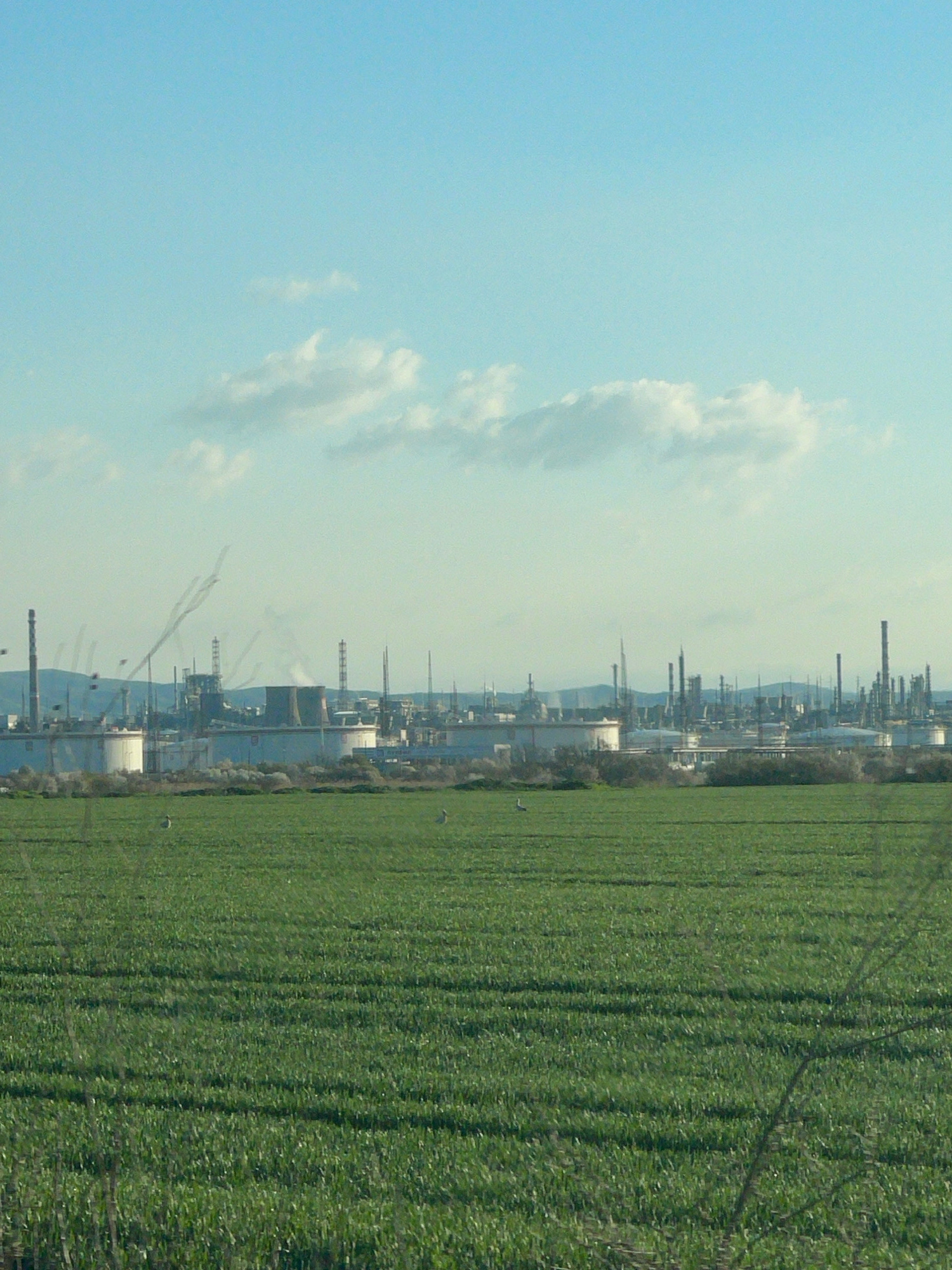The image shows a landscape with a green field on the right and a clear blue sky with some white clouds on the left. In the middle, there is a skyline of industrial structures, possibly factories or r…read more