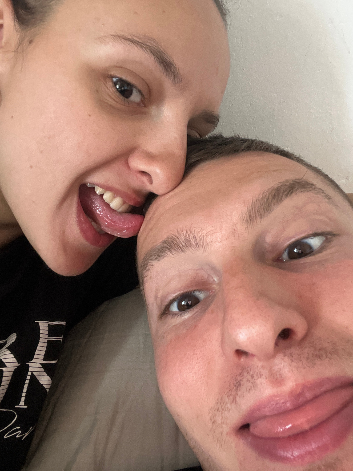 This close-up, rotated photograph captures two individuals, a man and a woman, engaged in a playful and affectionate interaction in what appears to be an indoor setting, likely in Saarbrücken, Germany…read more