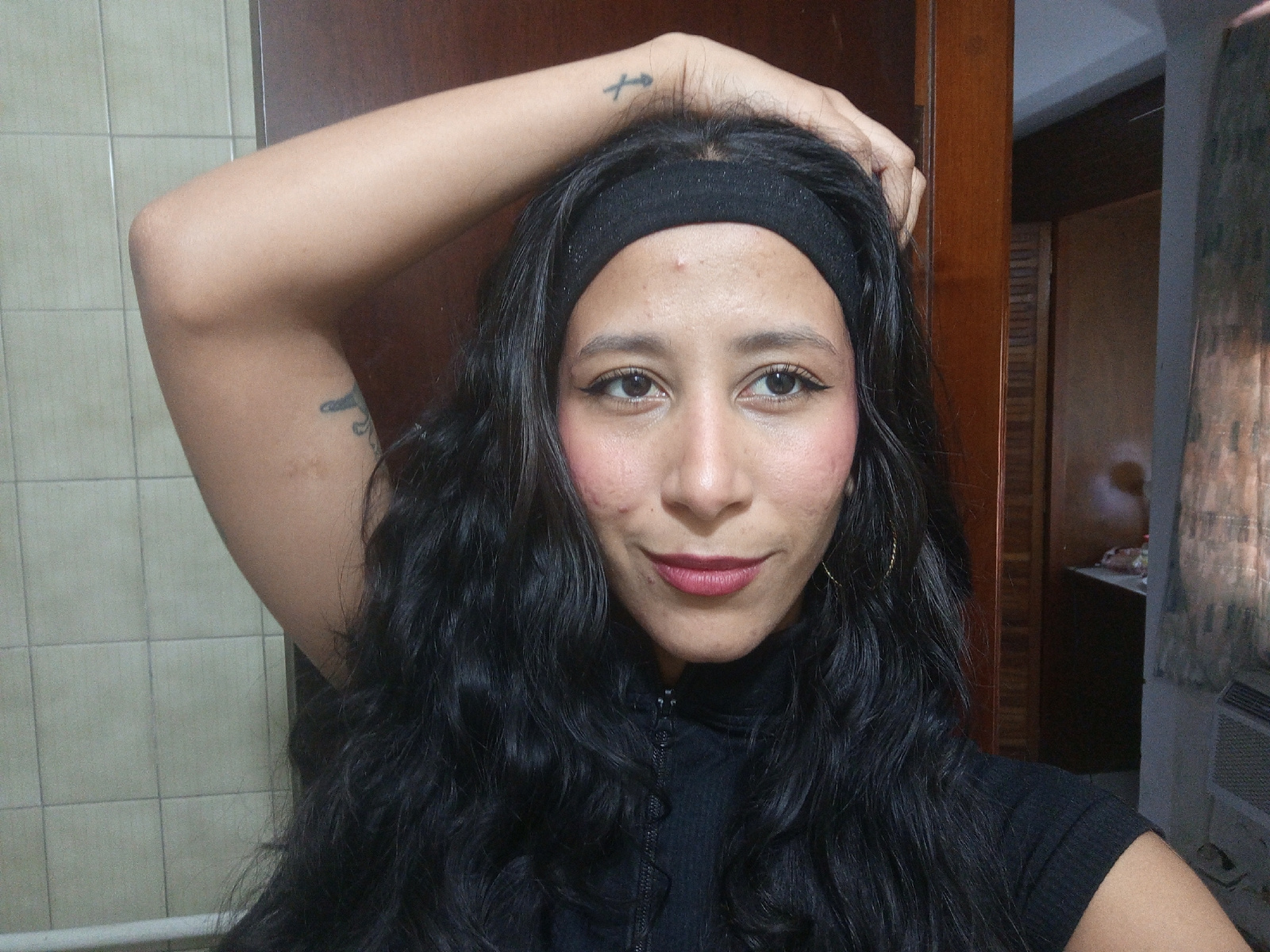 This is a close-up, indoor portrait of a woman in Porlamar, Venezuela. The subject is a woman with long, dark, wavy hair, wearing a black headband and a black ribbed top with a zipper. She poses with…read more
