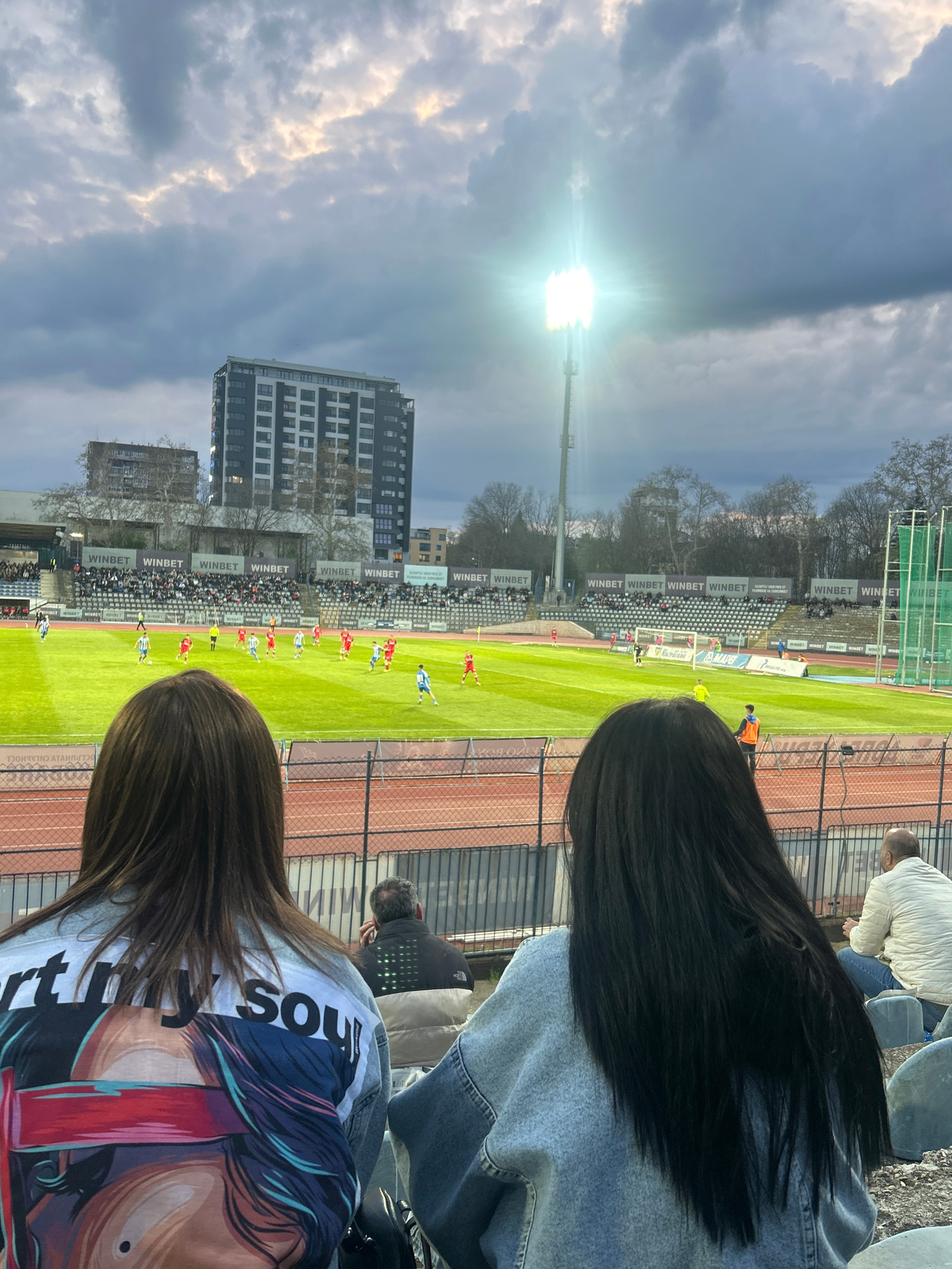 The image captures a soccer match from an elevated spectator perspective. A dense crowd fills the stadium seats, clad in various colors, with players on a vibrant green field below. Tall buildings ris…read more