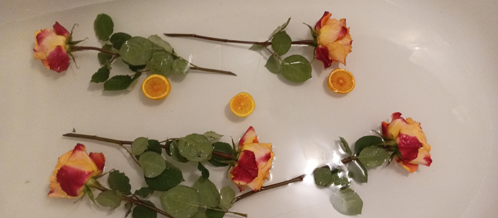 Four multi-colored roses and four orange halves are floating in clear water, likely within a white bathtub or similar container. The roses exhibit petals with shades of yellow, orange, and red/pink, a…read more