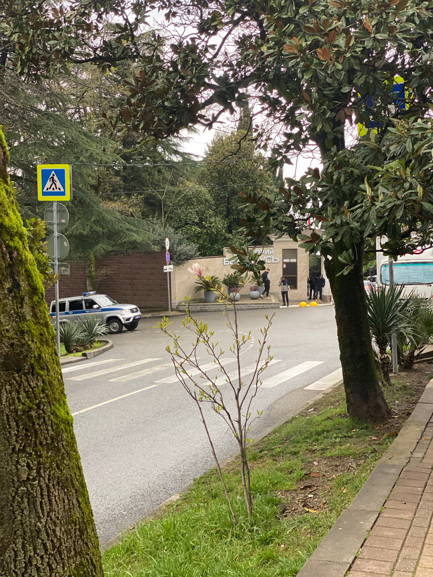 The scene depicts a street in Sochi, Russia. A police car is parked on the side of the road near a crosswalk. Several people are near a building with signage in Russian. A pedestrian crossing sign is…read more