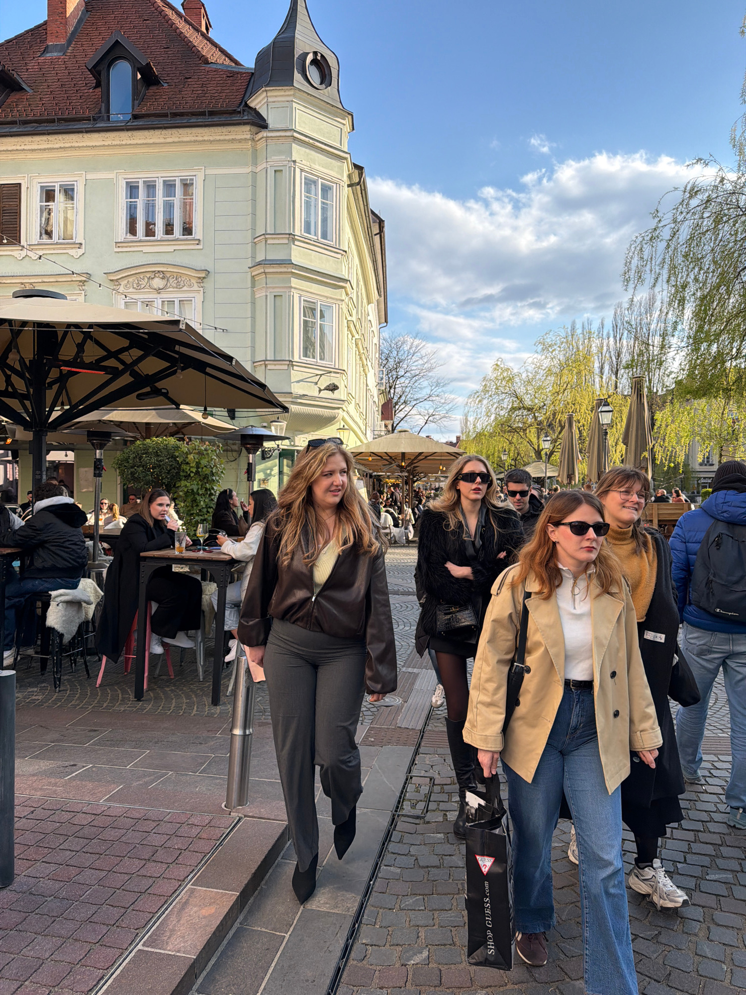 The image shows a group of four women standing on a cobblestone street. The street appears to be a pedestrian zone with outdoor seating for cafes and restaurants. The women are all dressed in casual cā¦read more