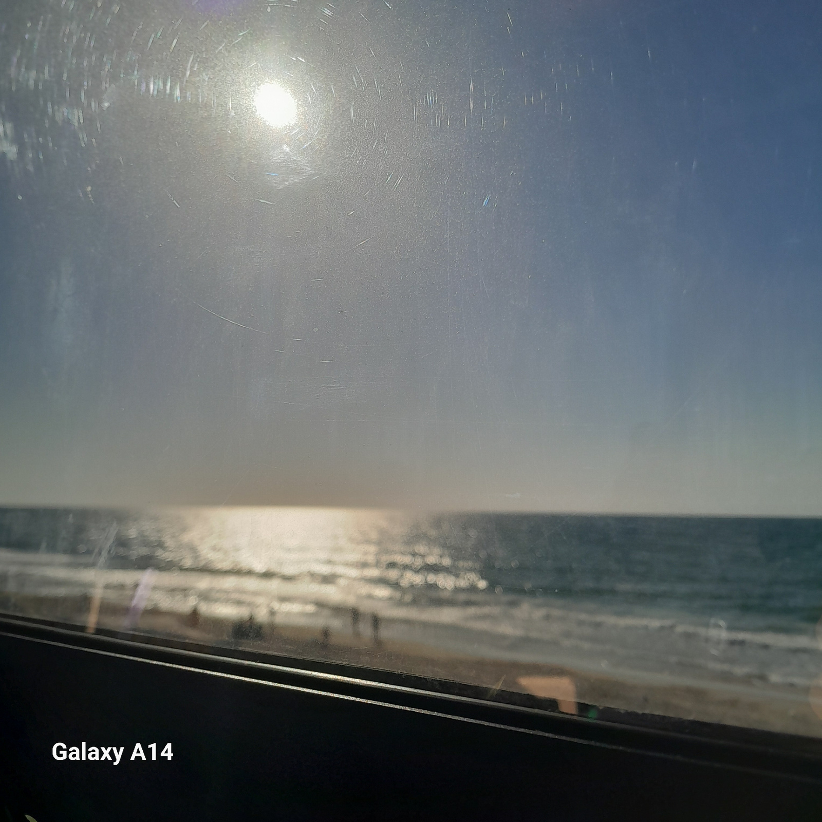 The image appears to be taken through a window. Outside, there is a view of the sky and what seems to be a body of water, possibly the sea or a large lake. The sun is visible in the sky, creating a gl…read more