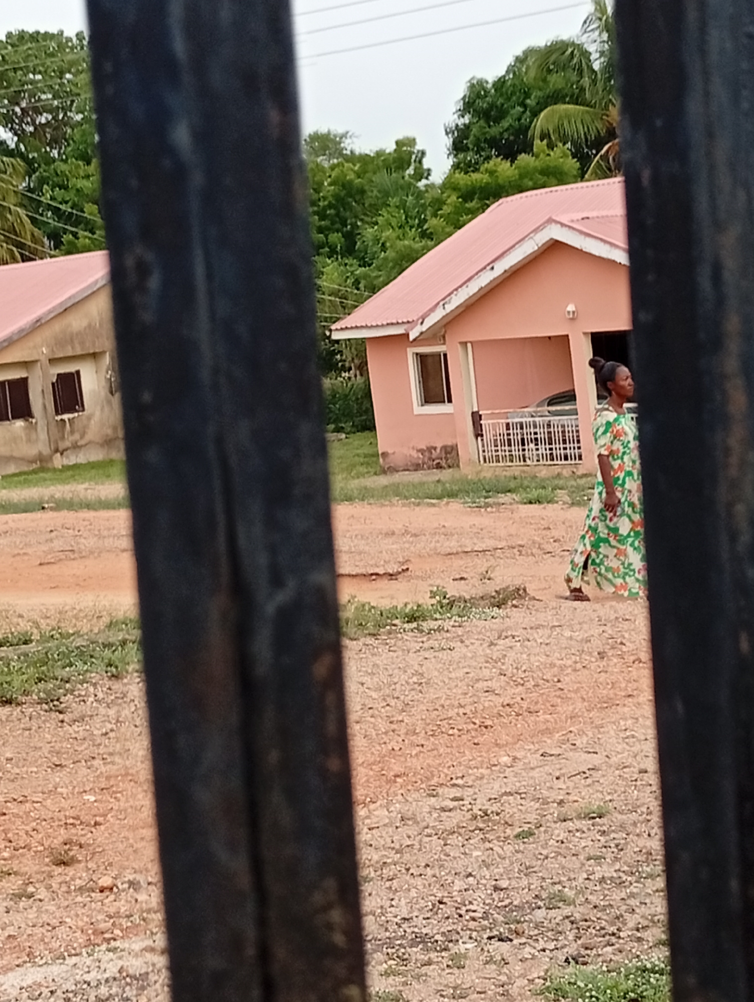 The image, likely taken in Adankolo, Nigeria, shows a woman walking on a dirt road. She wears a long, light-colored dress with green and white floral patterns. Her hair is pulled back. Behind her is a…read more