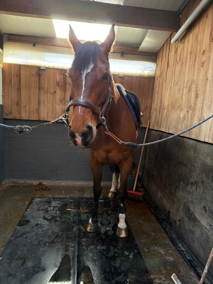 A bay horse with a prominent white blaze, extending from its forehead to its muzzle, stands centrally in what appears to be a washing or grooming stall within a stable facility in Enghien, Belgium. Th…read more