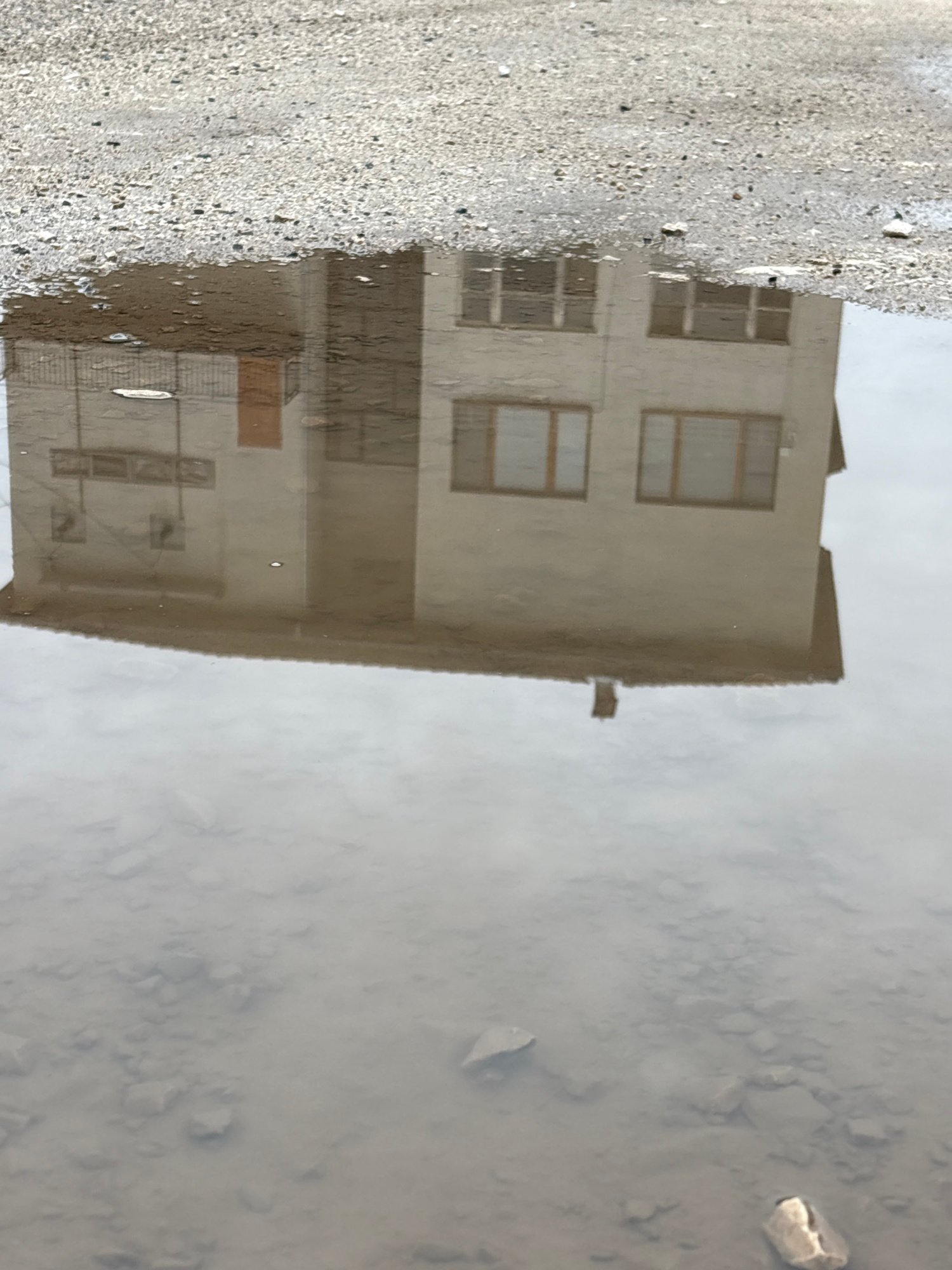 The image depicts the reflection of a building in a puddle. The building is light-colored with several windows and a door. A stone surface borders the puddle. The location is likely Tryavna, Bulgaria,…read more