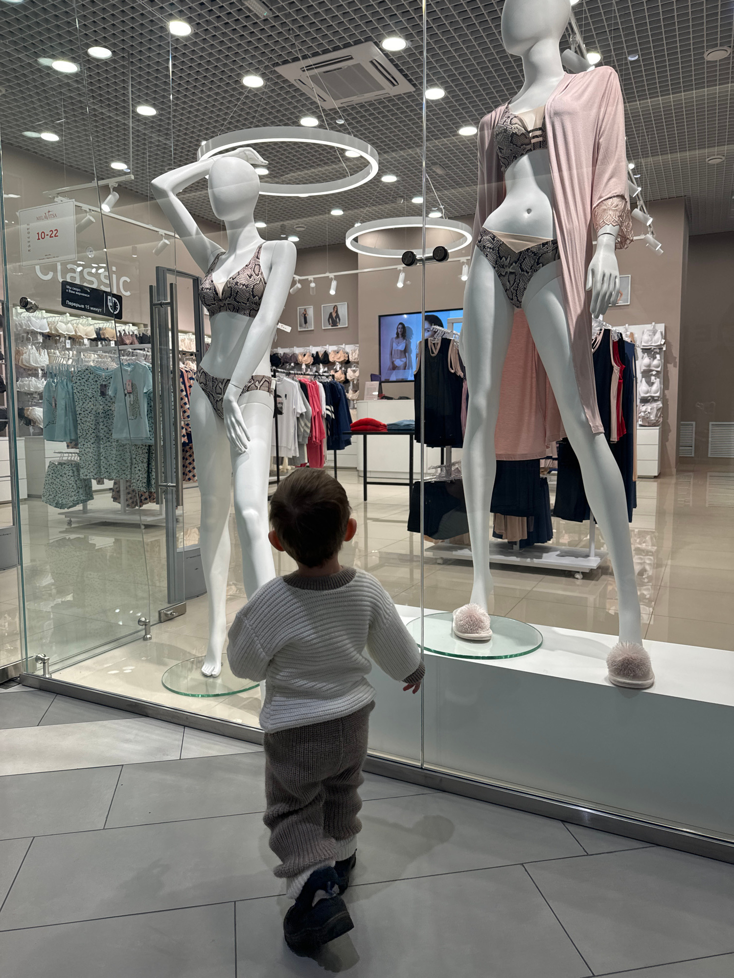 A child is observed examining a display of mannequins in a shop window at an unknown retail location in the city of Kriukovo, Russia. The mannequins, styled in undergarments, are positioned within the…read more