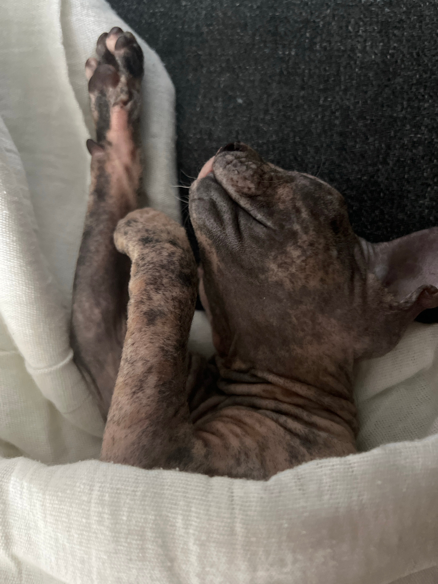 A hairless Sphynx cat is depicted sleeping peacefully, curled up on its side, partially covered by a white blanket or fabric. The cat's skin displays a distinctive mottled pattern of gray, brown, and…read more