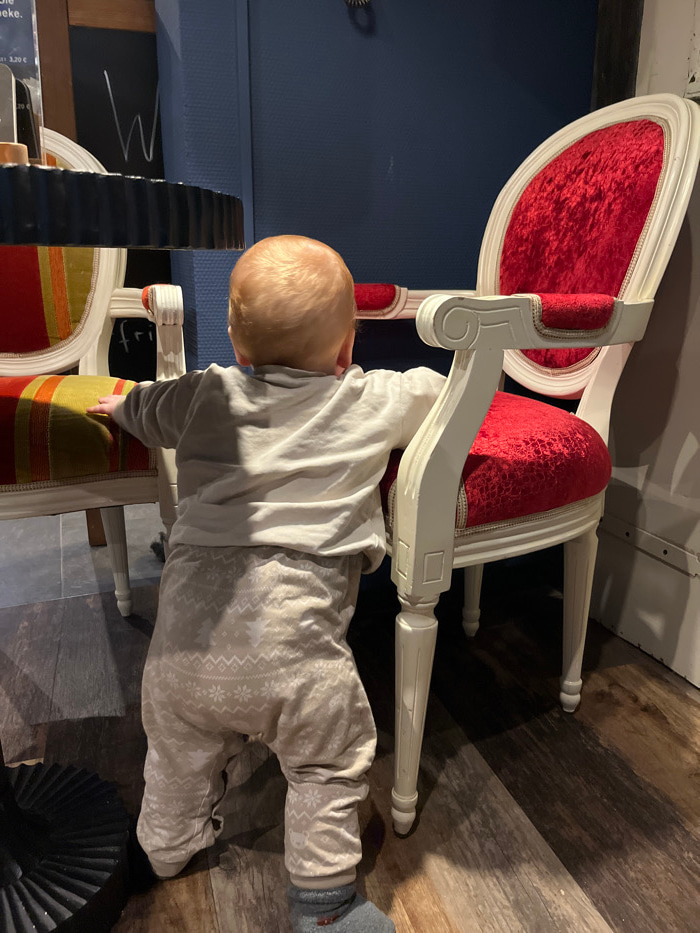 A baby wearing a white and gray pajama set stands next to two antique chairs. The chairs have white frames and colorful striped or red velvet cushions. The baby is partially obscured by one of the chaβ¦read more