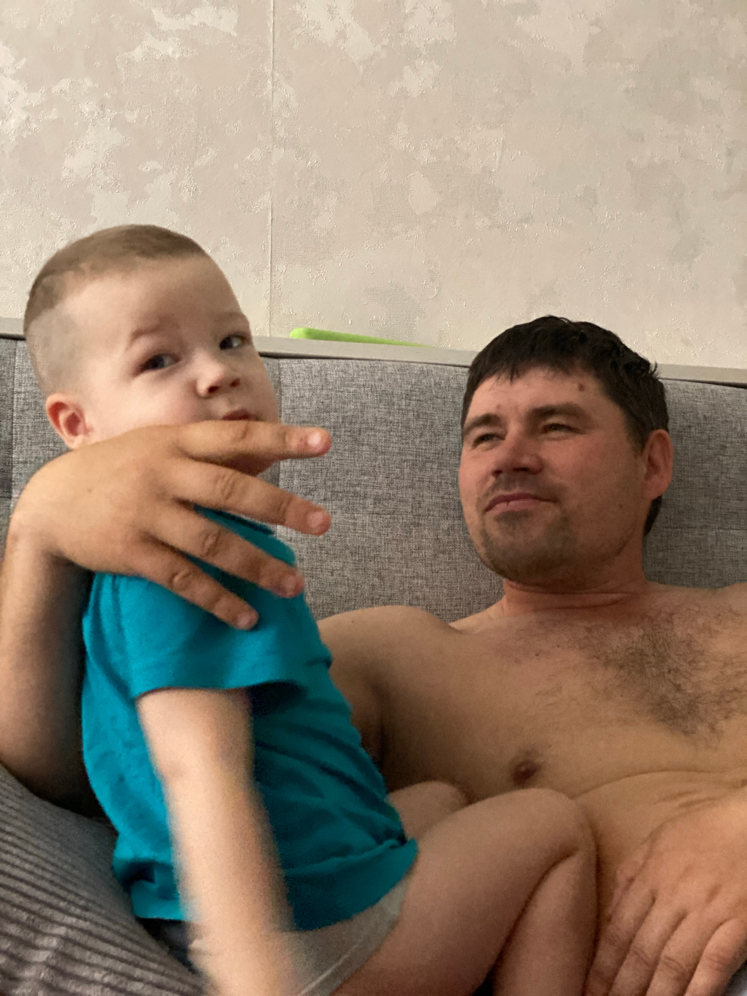 A man and a young child are lying on a grey sofa. The man is shirtless and has dark hair. The child, wearing a teal shirt, is positioned on the man's chest with their hand partially obscuring their fa…read more