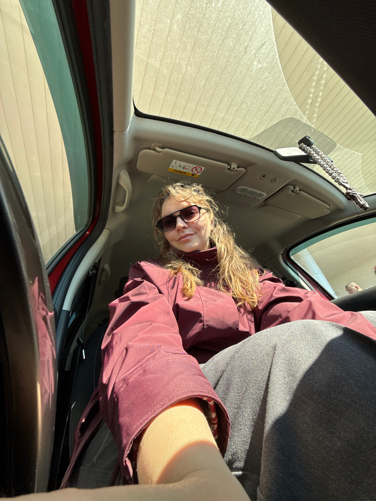 This media file, oriented at a 90-degree counter-clockwise rotation, captures the interior of a car, likely in Aksay, Kazakhstan, on a very bright, sunny day. The primary subject is a young woman, pos…read more