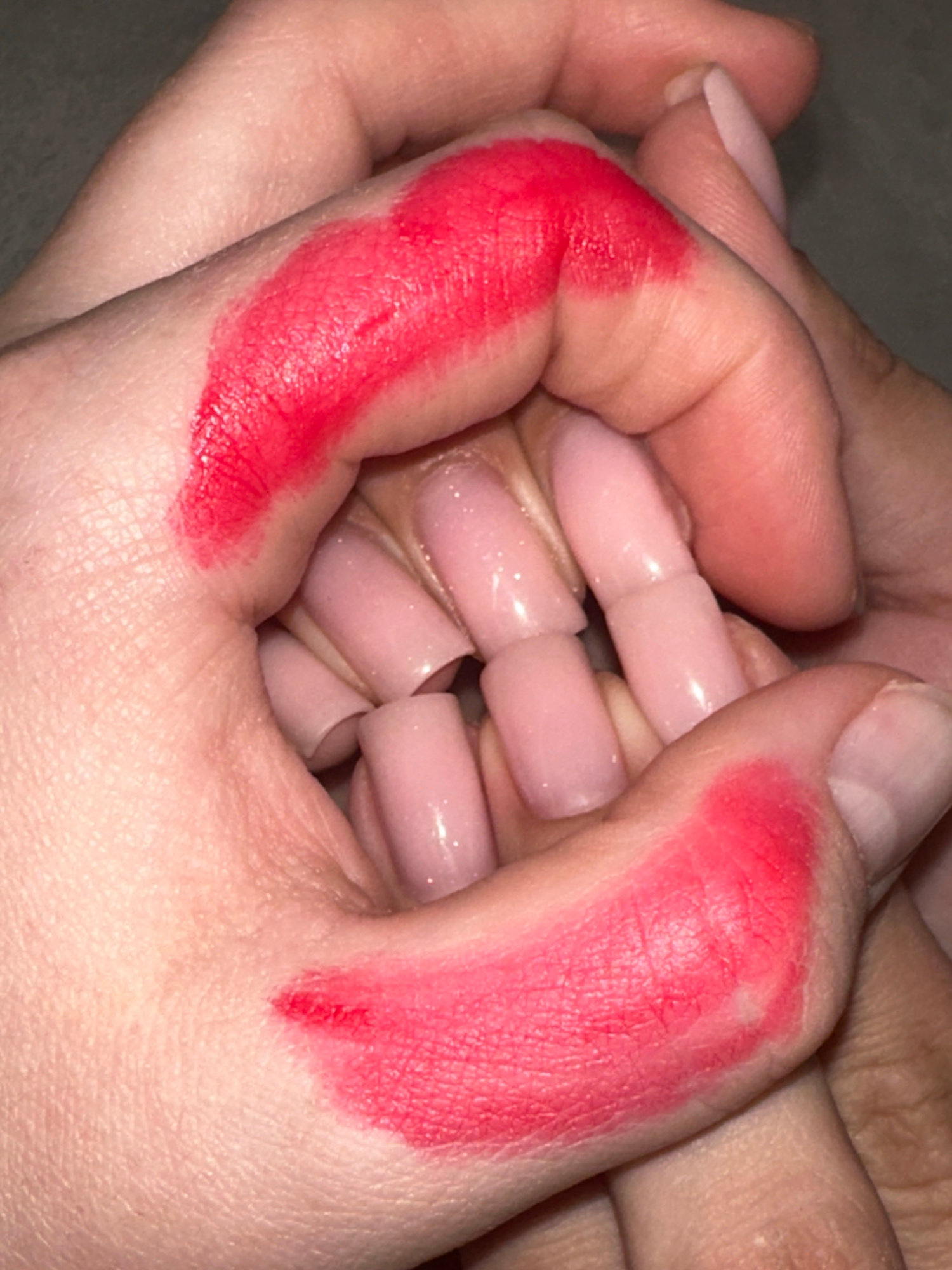 This close-up image features two intertwined hands, against a dark, out-of-focus background. One hand, positioned centrally, exhibits long, light pink or nude-colored acrylic nails with a glossy finis…read more