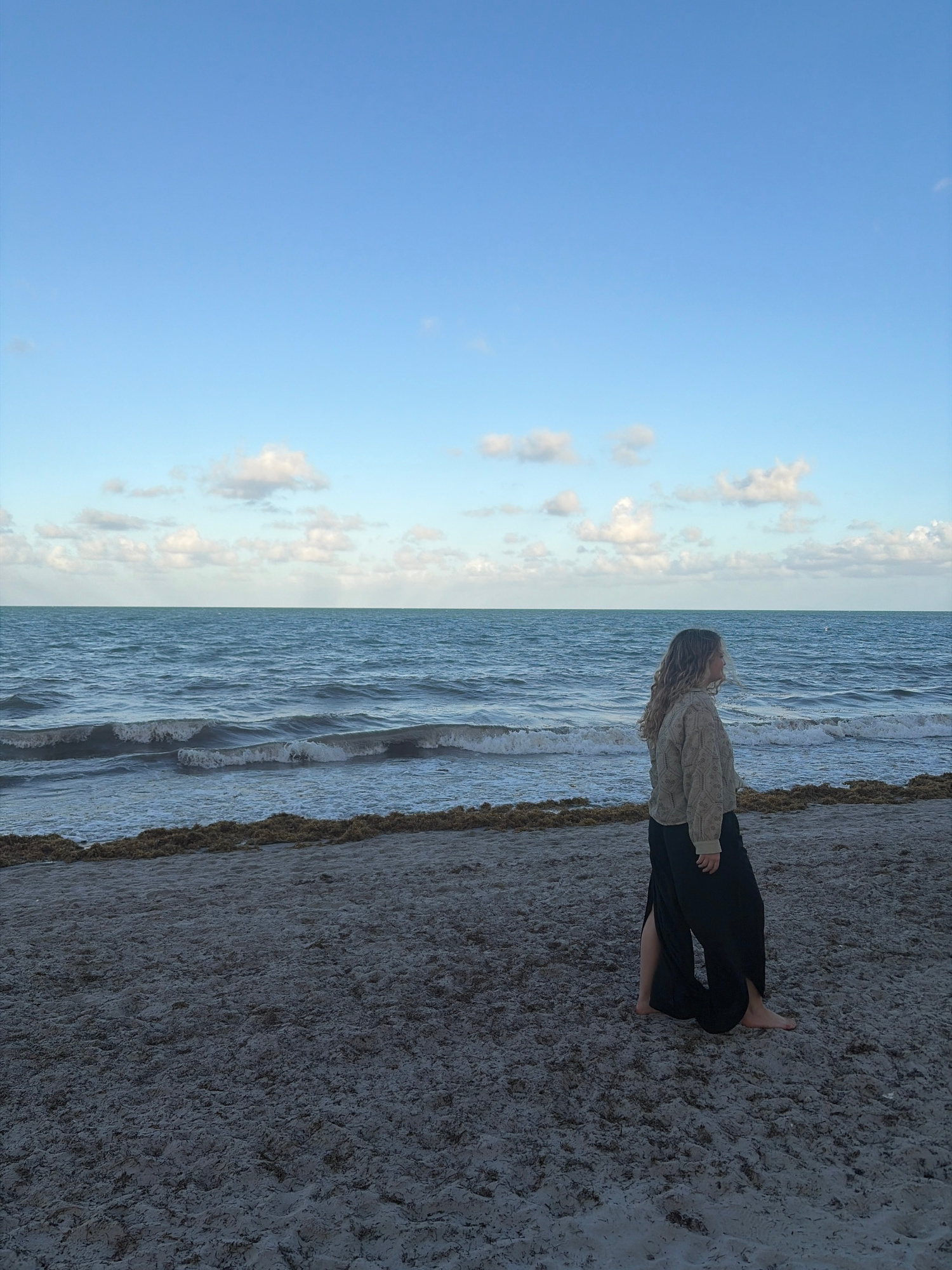The image depicts a beach scene in Key Biscayne, United States of America. The sky is predominantly blue with scattered white clouds. The ocean is visible, with waves approaching the shoreline. A pers…read more