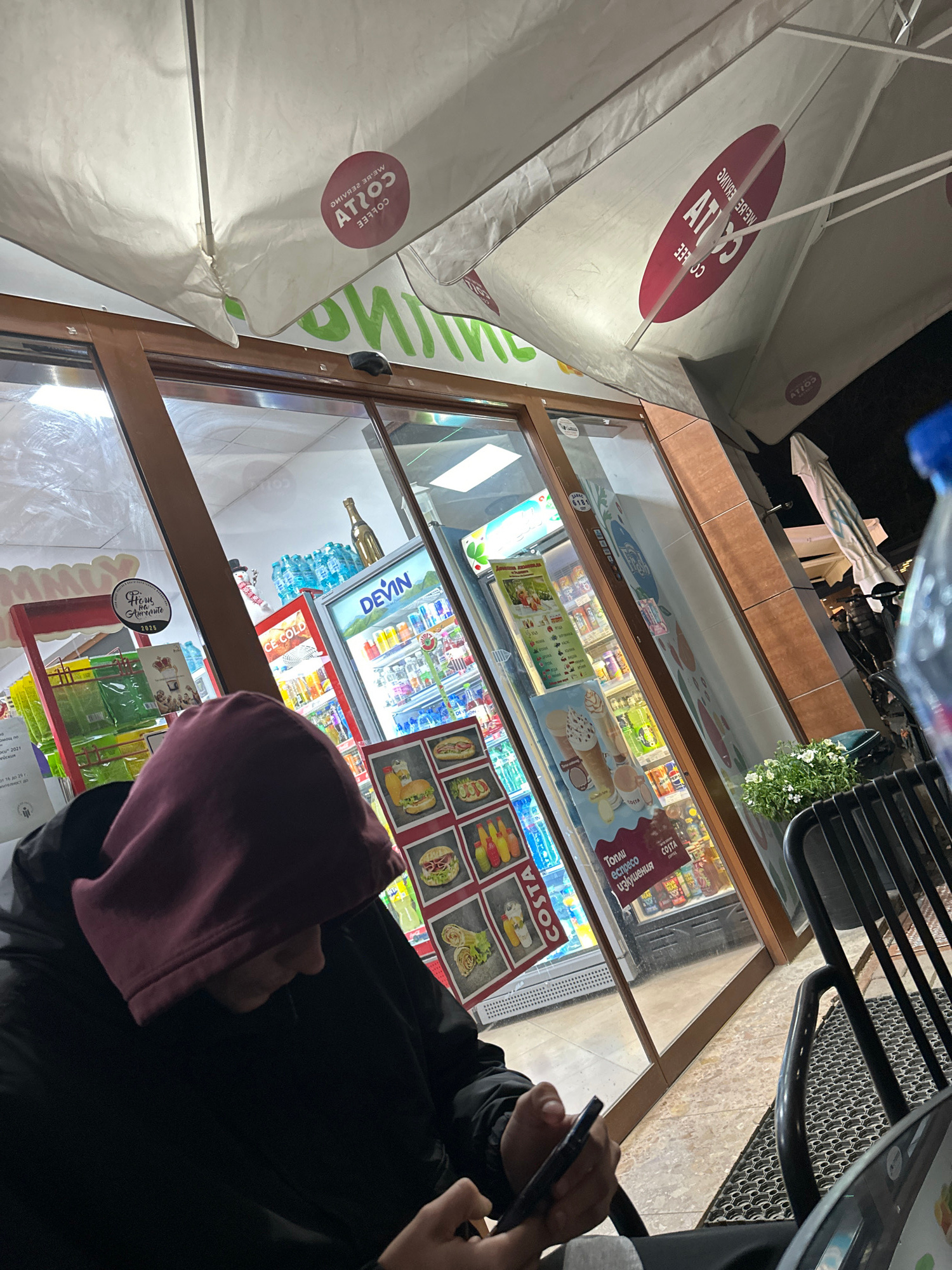 A high-angle shot captures a person seated at an outdoor table, seemingly engaged with their mobile phone. The scene unfolds in front of a commercial establishment with glass frontage displaying vario…read more