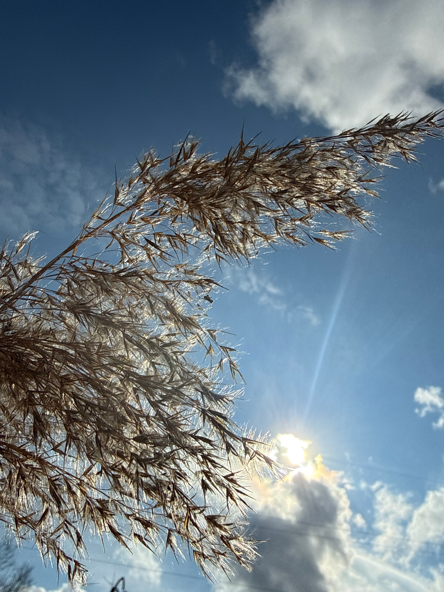 The image, likely captured in Dmitrov, Russia, features a close-up, upward view of dried reeds against a backdrop of a partially cloudy, blue sky. The sun is positioned behind a cluster of clouds on the right side of the frame, creating a bright glare. The reeds, predominantly brown, are partially illuminated by the sun, causing a shimmering effect. The sky transitions from a deeper blue in the lower left to a lighter blue where clouds are present. There are no people visible in the image. The focal point is the reeds and their interplay with the sunlight and clouds. | Open Wire