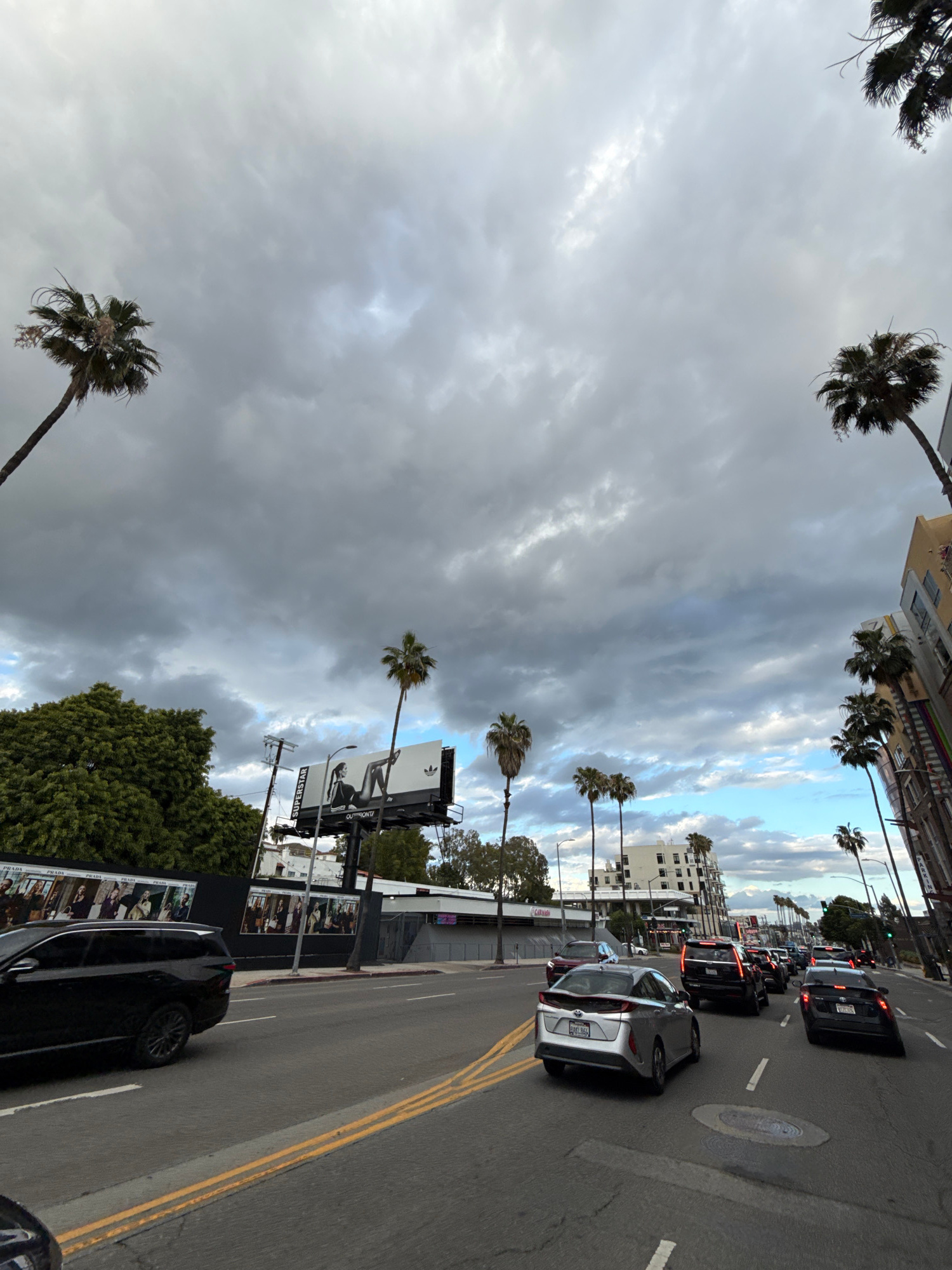 The image captures a street in Los Angeles, California, recognizable by the palm trees and the urban landscape. The sky is overcast with dramatic clouds, hinting at possible inclement weather. Traffic…read more