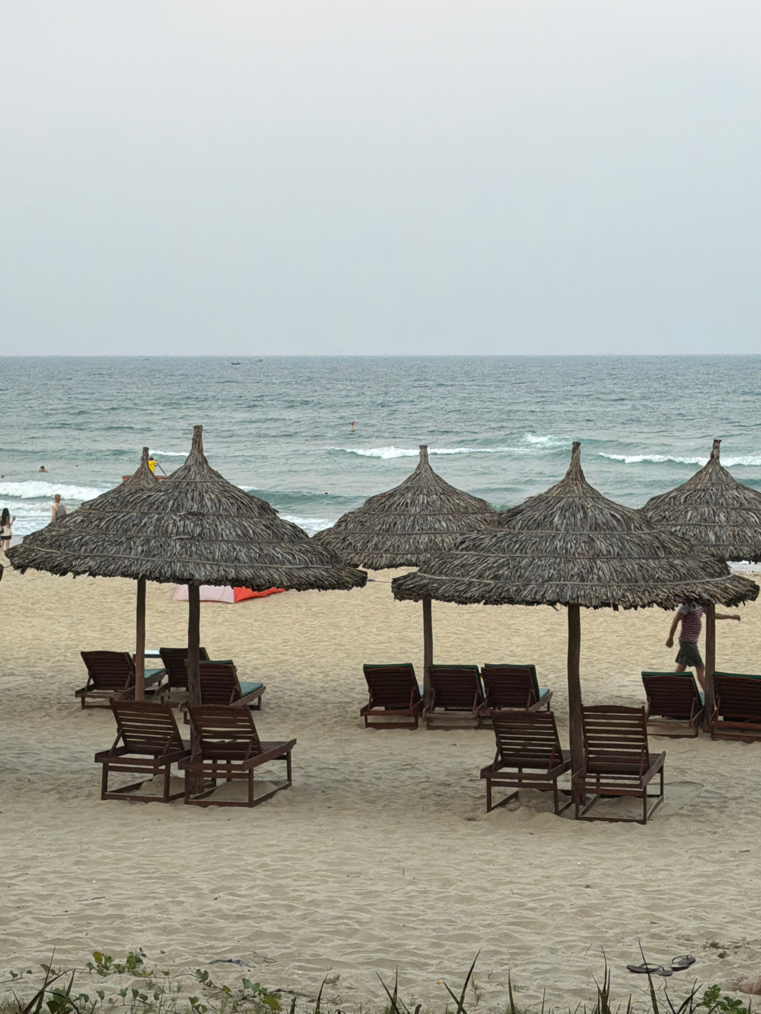 The image captures a coastal scene, likely on a beach in Đà Nẵng, Vietnam. The dominant features include a row of beach umbrellas with thatched roofing, positioned along the sandy shoreline. Adjacent…read more
