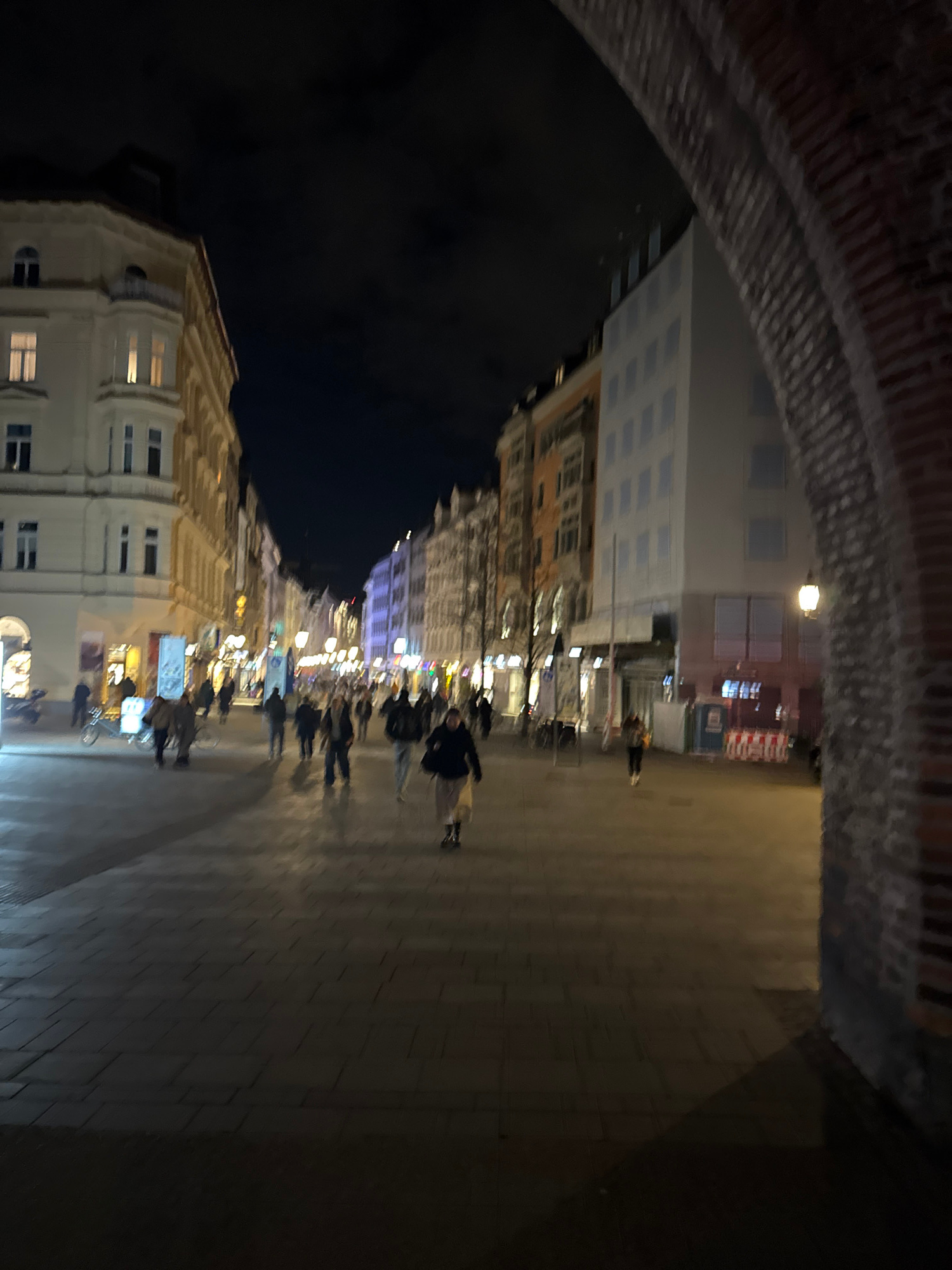 The image displays a nighttime view of a pedestrian street in Munich, Germany, looking eastward from the Karlstor (Karl's Gate) archway into Neuhauser Straße. The right foreground is dominated by a se…read more