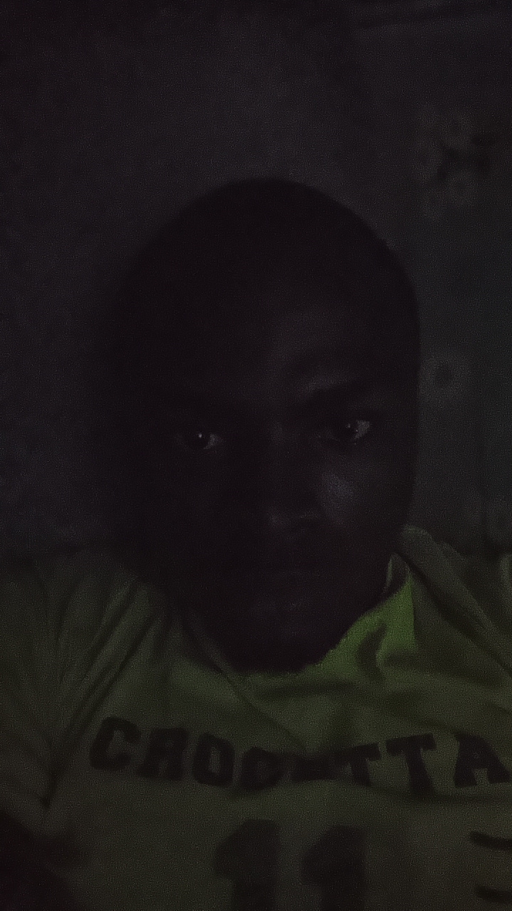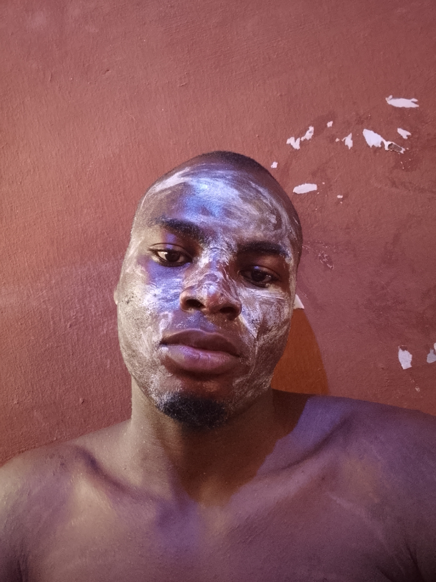A medium-shot photograph depicts a dark-skinned African man with short, dark hair. He has a beard and a significant amount of white cream or paste applied to his face and forehead. His expression appe…read more