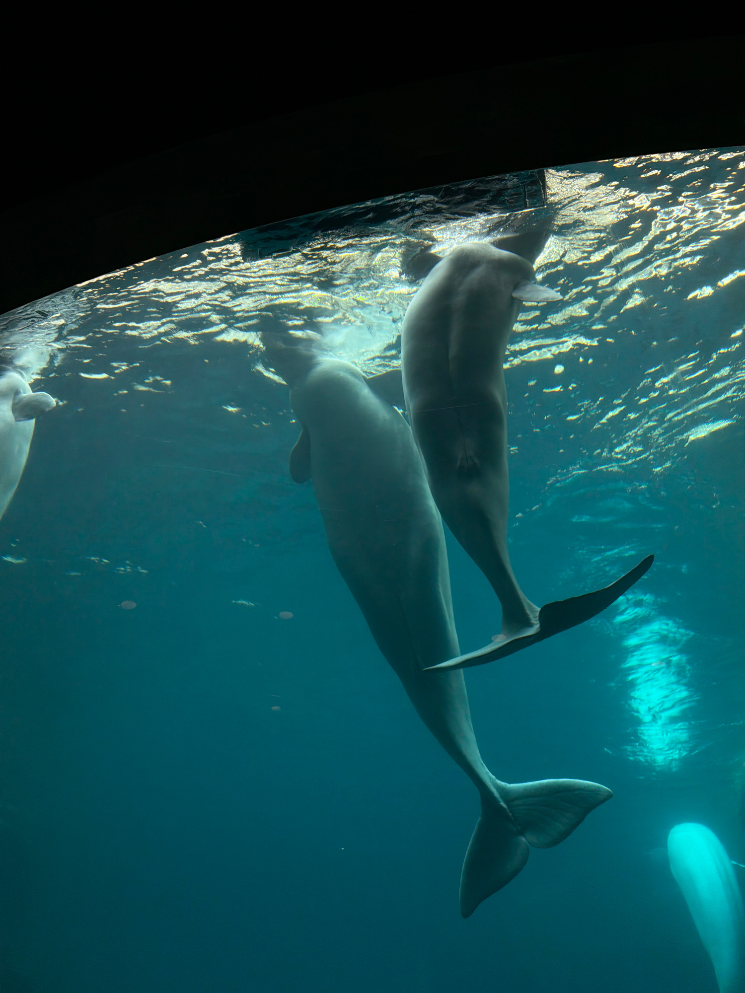 The image shows two beluga whales swimming in an aquarium tank. The tank appears to be constructed from clear glass, allowing a view of the whales' bodies as they move through the water. The lighting…read more