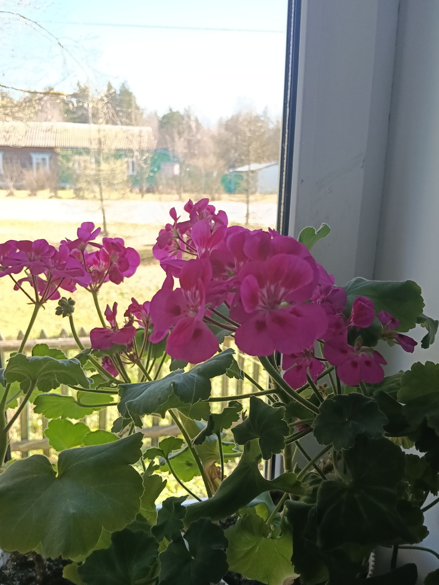 A close-up shot displays a geranium plant with vibrant pink flowers and green leaves, situated on a windowsill. Through the window, the blurred scene reveals a residential area in Красный Маяк, Russia…read more