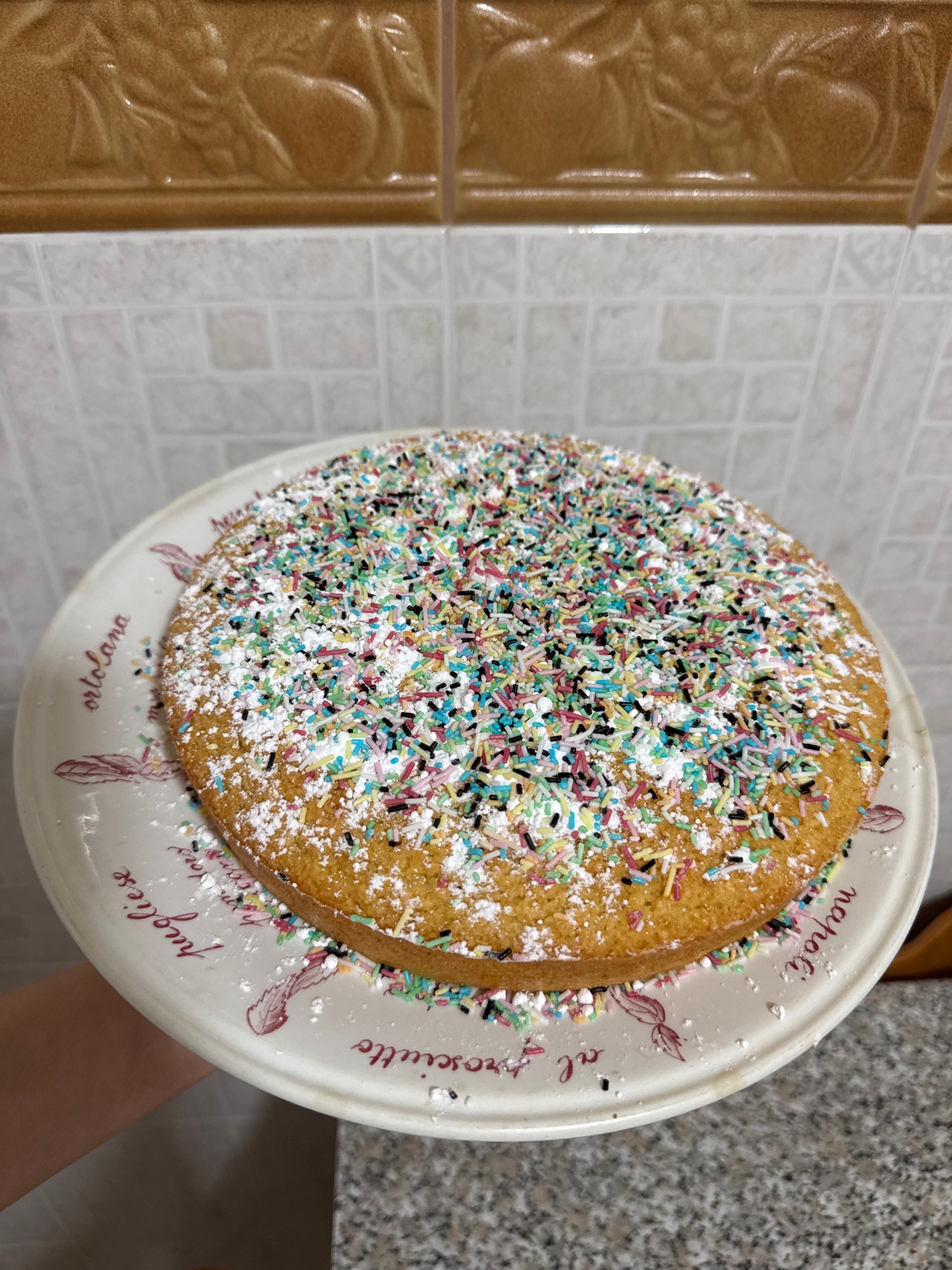 A round cake, dusted with powdered sugar and covered in colorful sprinkles, sits on a decorative plate. The plate has text that says "napoli", "prosciutto", and "ortolana pugliese". The background sho…read more