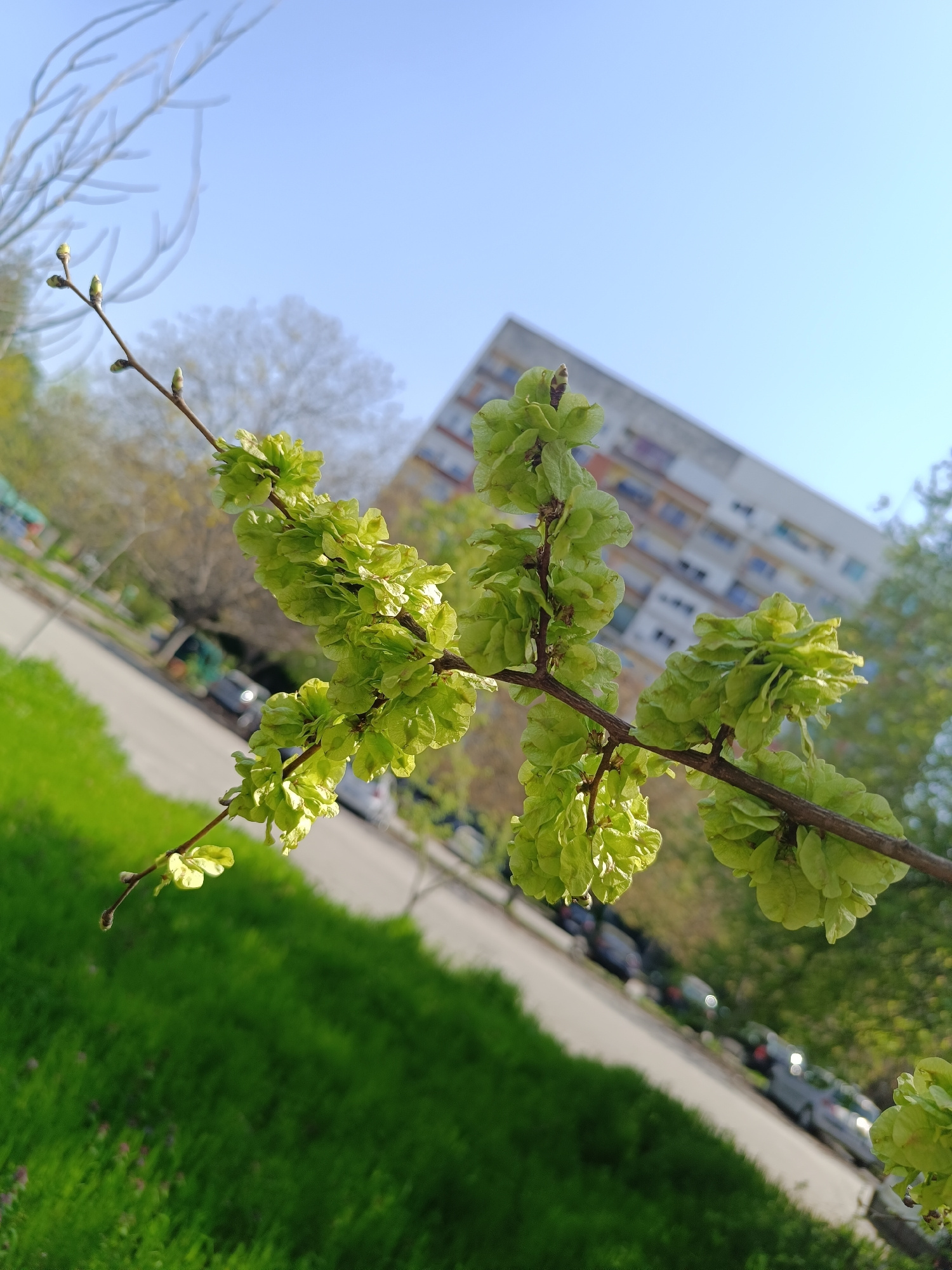 The image presents a close-up view of a tree branch, likely an elm, laden with numerous light green, winged seed pods (samaras) and some emerging buds, indicating early spring. The branch, positioned…read more