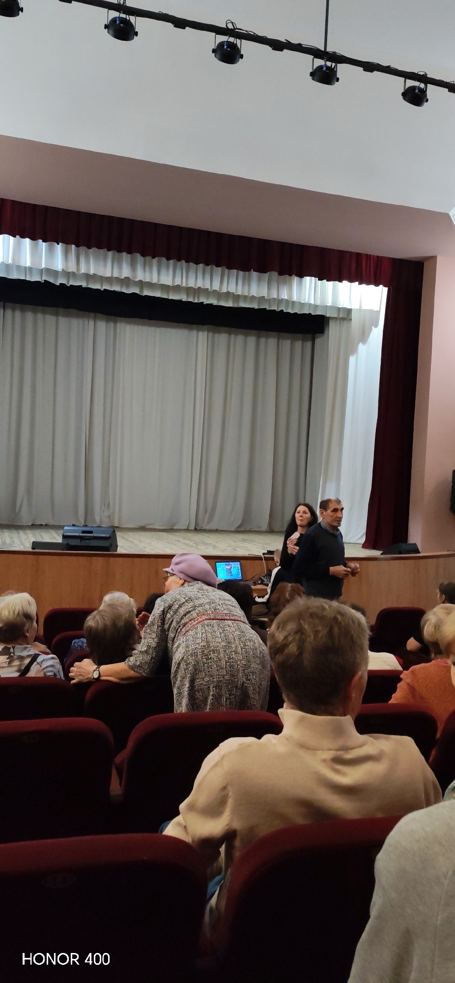 The image shows the interior of a small theater or auditorium. There is a stage with white and maroon curtains. On the stage, a man and woman are standing. In the foreground, there are several rows of…read more