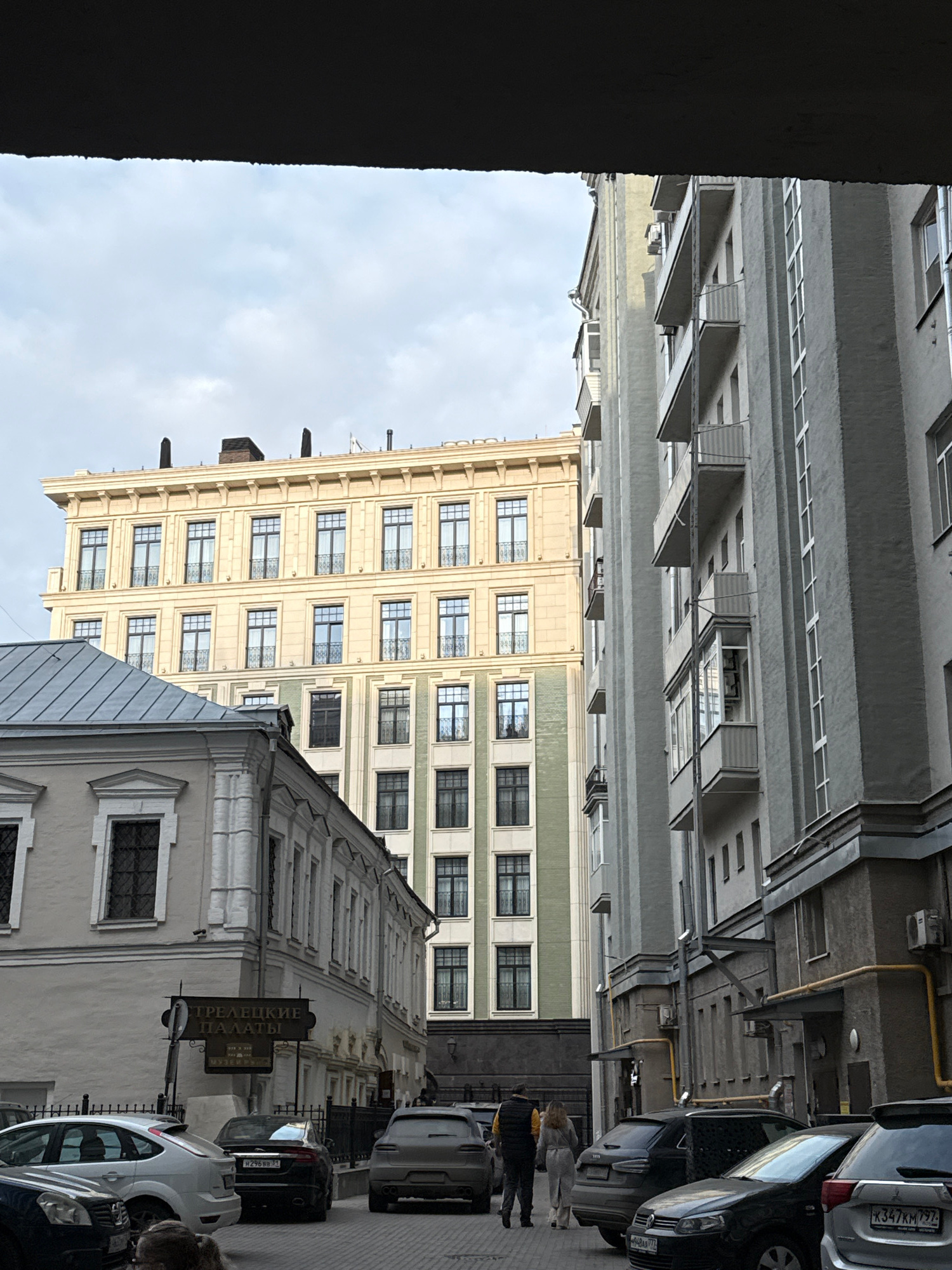 The image depicts an urban street scene in Lavrushinsky Lane, Moscow, Russia, characterized by a mix of architectural styles under an overcast sky. The view is framed by a dark, undefined overhead str…read more