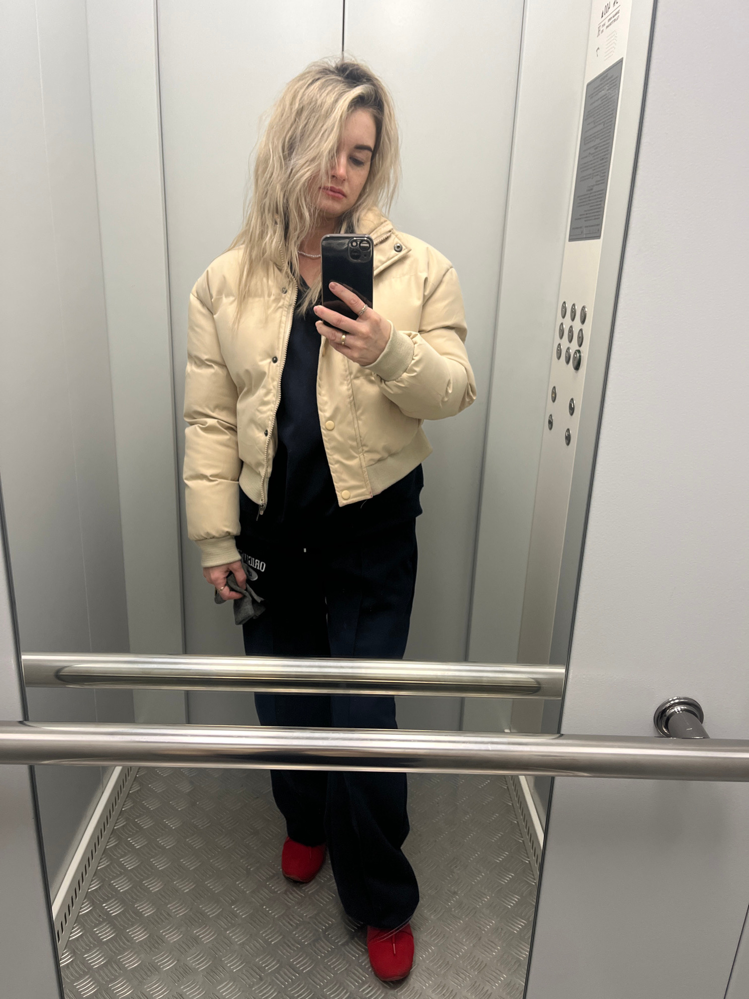 A female is standing in an elevator taking a picture of herself. She is wearing a light-colored puffer jacket, black pants, and red shoes. She is holding a black smartphone in her right hand. The elev…read more