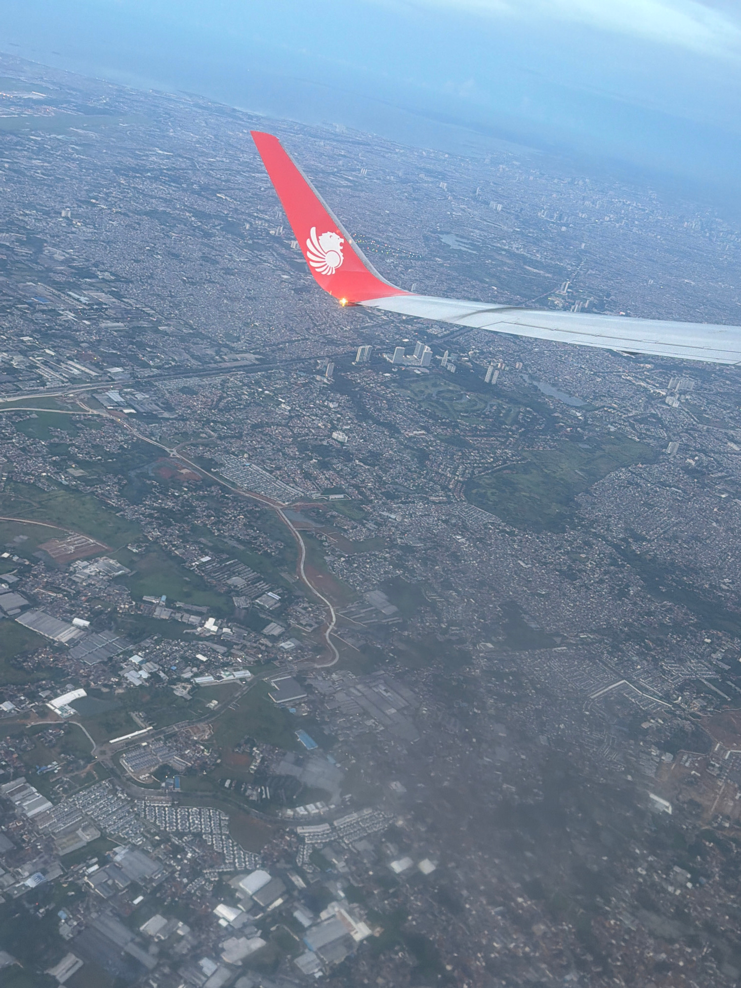 The image shows an aerial view from an airplane over Ciakar, Indonesia. Visible is the wing of the plane, bearing a red color and the logo of a lion. Below, the landscape is dominated by a dense urban…read more