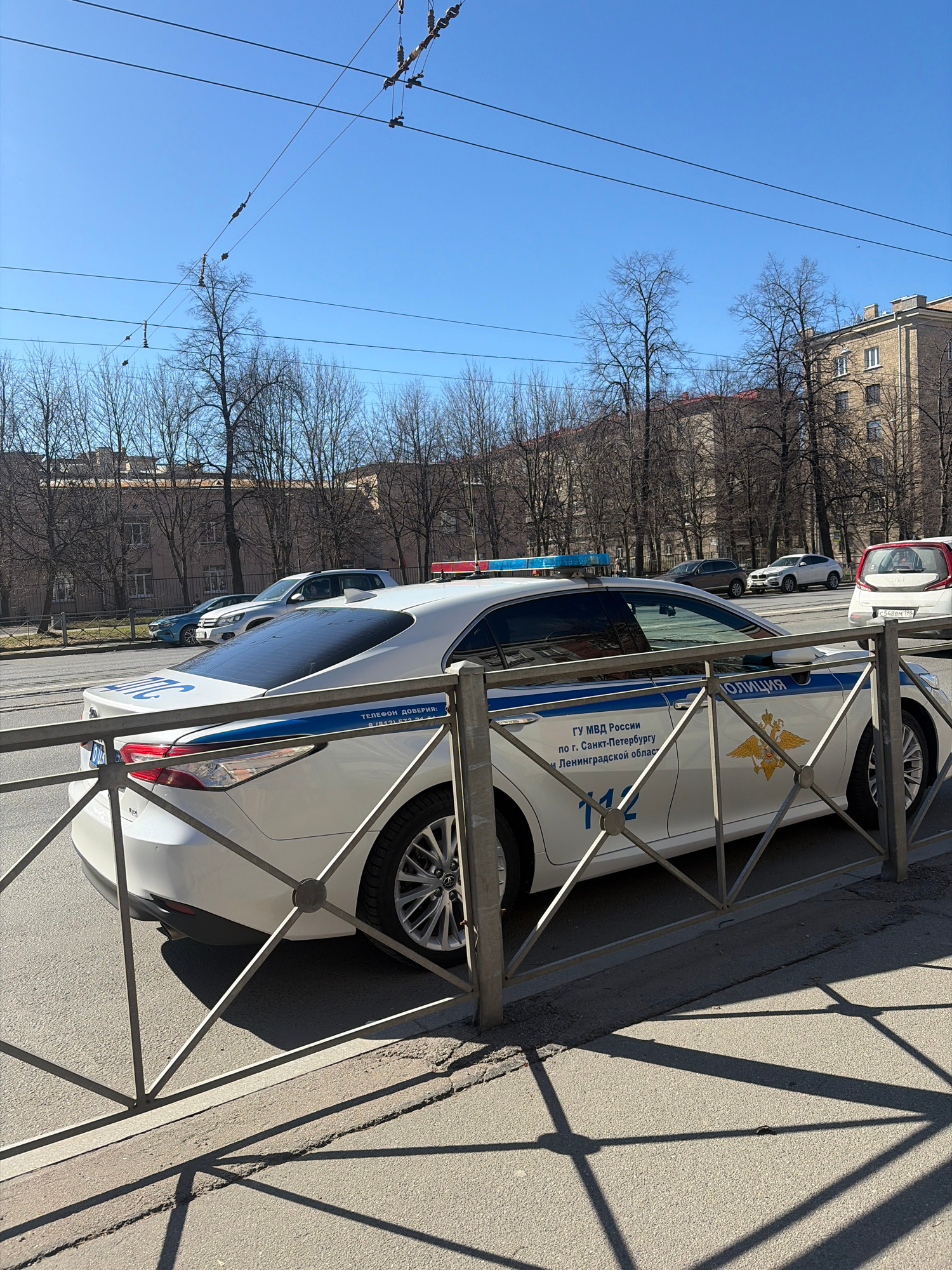 The image shows a white Russian police car parked on a city street. The car has the word "ПОЛИЦИЯ" (POLICE) in blue letters on its side, along with the Russian coat of arms and official lettering indi…read more