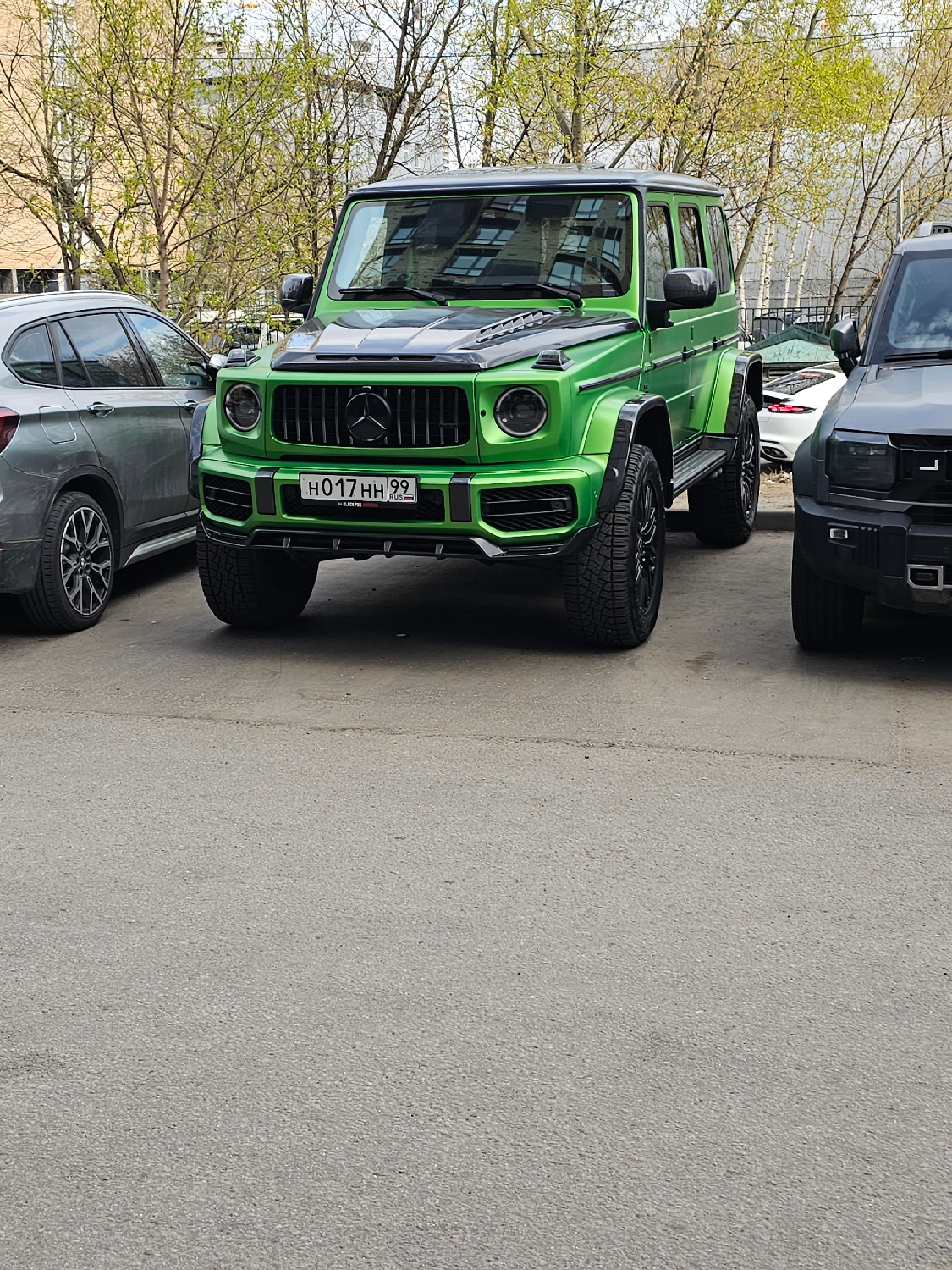 The image captures a vibrant green Mercedes-Benz G-Wagen (G-Class) parked on an asphalt surface in Khimki, Russia. The vehicle is prominently featured, facing towards the right side of the frame, show…read more