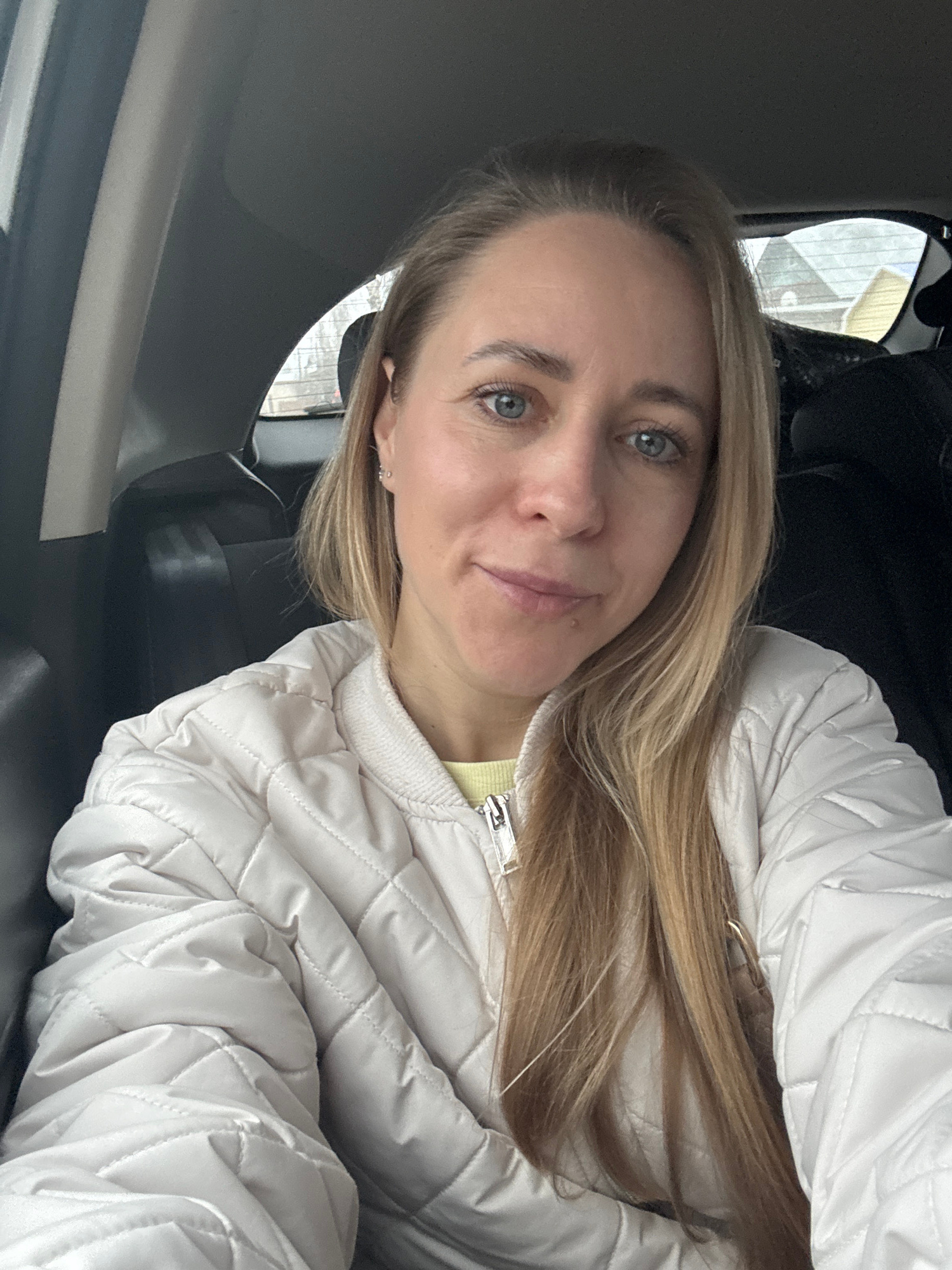 A woman with blonde hair and blue eyes is sitting in a car. She is wearing a light-colored quilted jacket and a yellow top. The car interior is dark. The car window shows a blurred outdoor scene that…read more