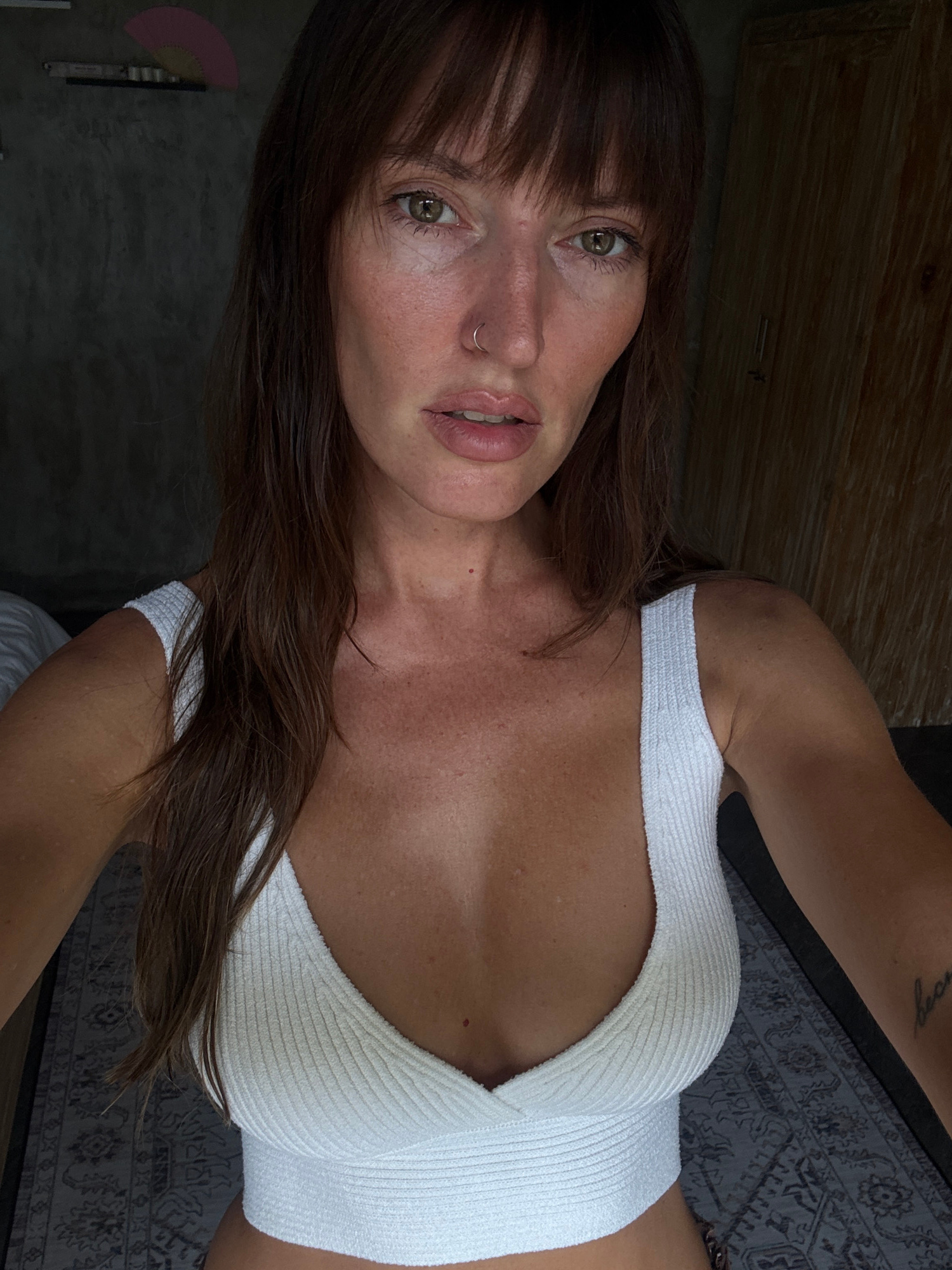 A young woman is centered in a low-angle, close-up selfie indoors. She wears a white, ribbed, cropped tank top. She has fair skin, brown hair with bangs, and a nose ring. Her hair is partially coverinβ¦read more