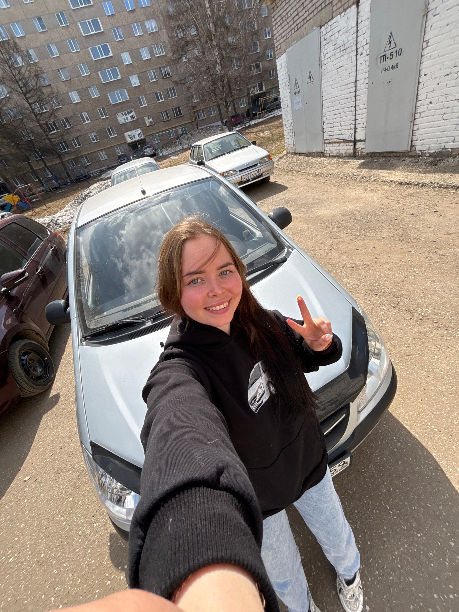 The image is a bright, wide-angle outdoor selfie featuring a young woman in Izhevsk, Russia, taken during clear daytime weather. The main subject is a young woman with long, dark hair and light-color…read more