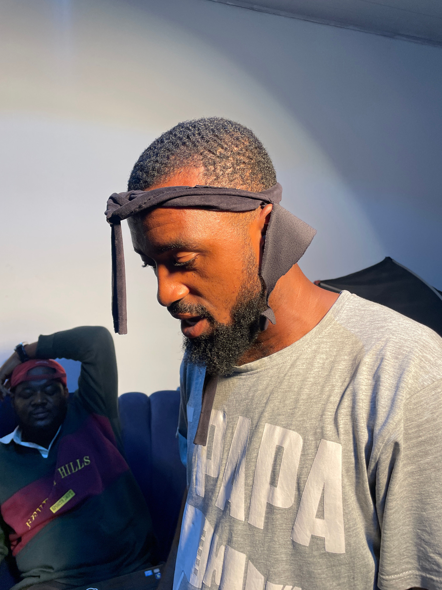 Two Black men are present in the image. One is wearing a grey t-shirt with white lettering. He has a black headscarf and a dark beard. A dark cylindrical object is affixed to the front of the headscar…read more