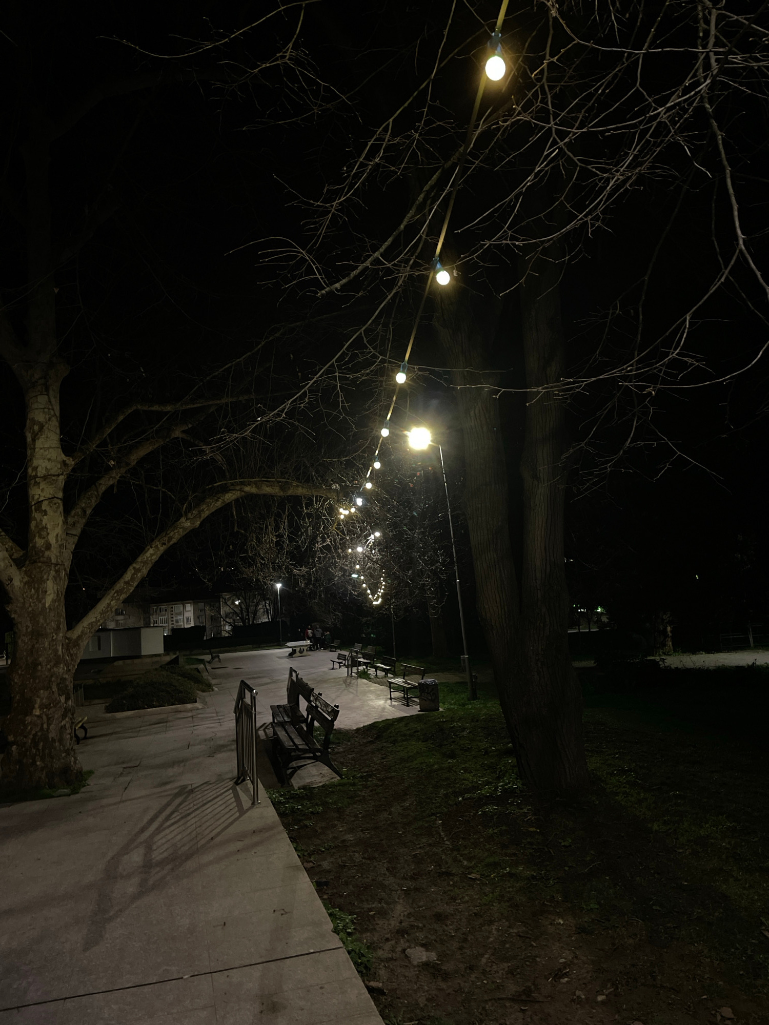 A nighttime scene in Veliko Tarnovo, Bulgaria, features a path lined with benches and illuminated by string lights. A large tree dominates the left side, its bare branches reaching up toward the light…read more