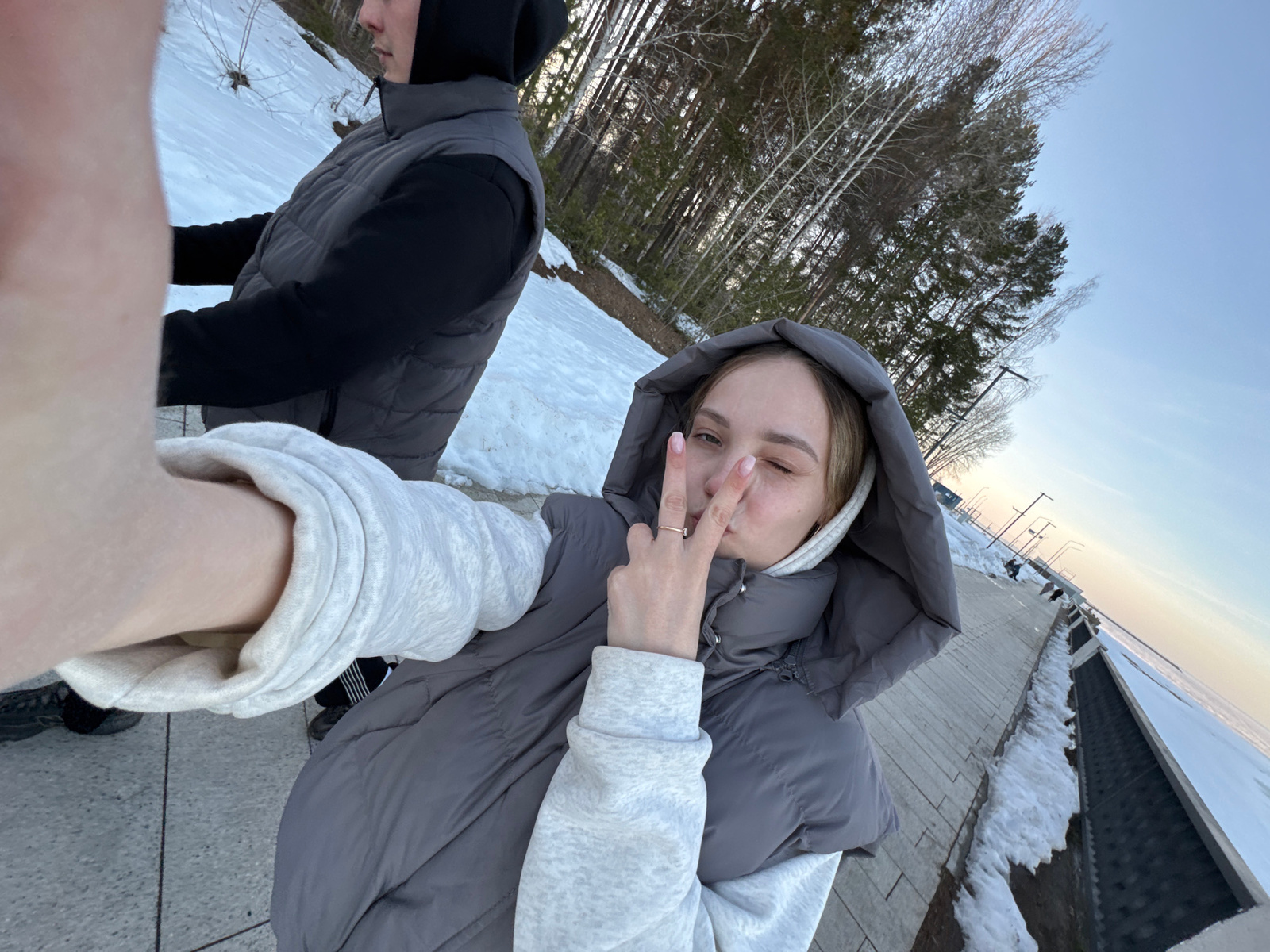 The image shows a selfie taken by a young woman outdoors in what appears to be a park or green space. The perspective is upside down. The woman is wearing a gray puffer vest with a hood, under which a…read more