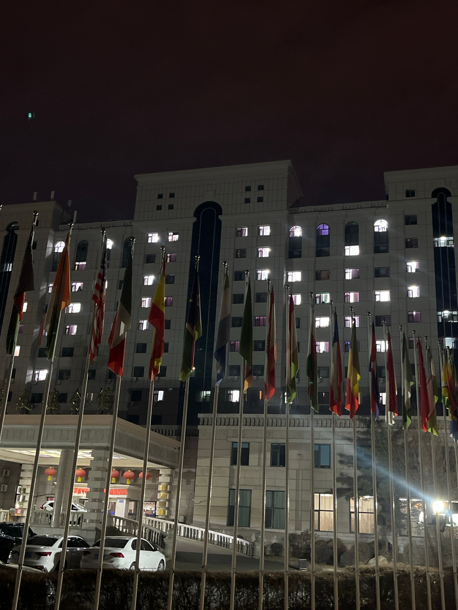 The image depicts the Changchun Guobinguan (Changchun International Guest House/Hotel) at night, located in Changchun City, Jilin Province, China. The scene is dominated by a large, multi-story, light…read more
