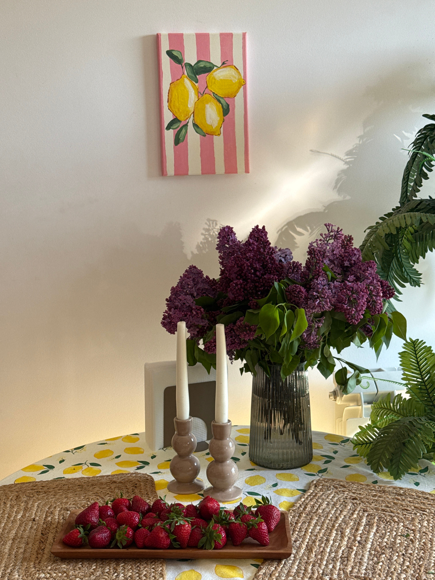 The image captures a vibrant and cheerful indoor still life, possibly within a home in Vozdovac Urban Municipality, Serbia. The scene is dominated by a decorative table arrangement and an artwork on a…read more