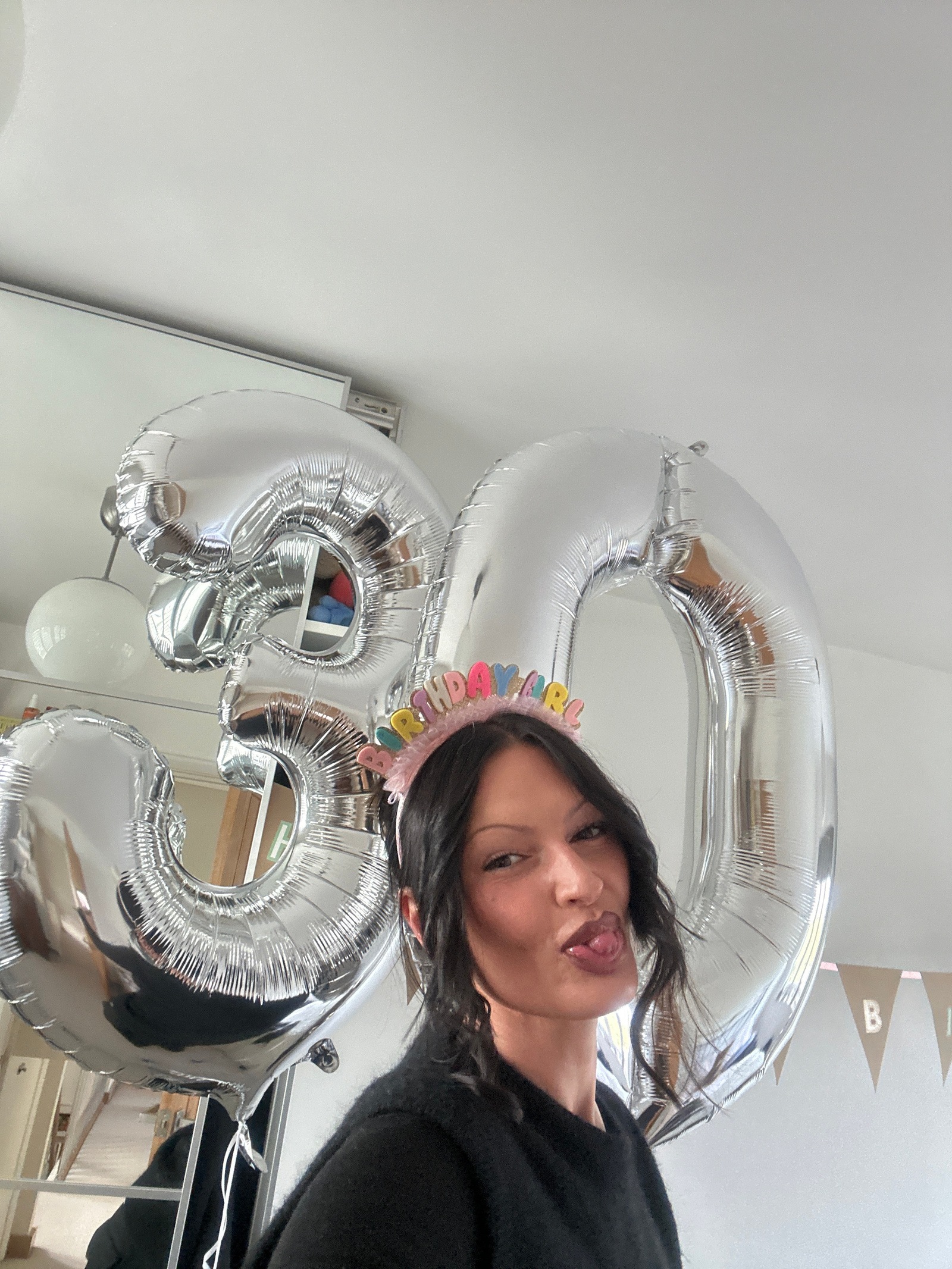 The image displays a female individual positioned from the chest up within an indoor setting. She has dark hair and wears a black, textured, long-sleeved top. On her head, she wears a pink headband wi…read more